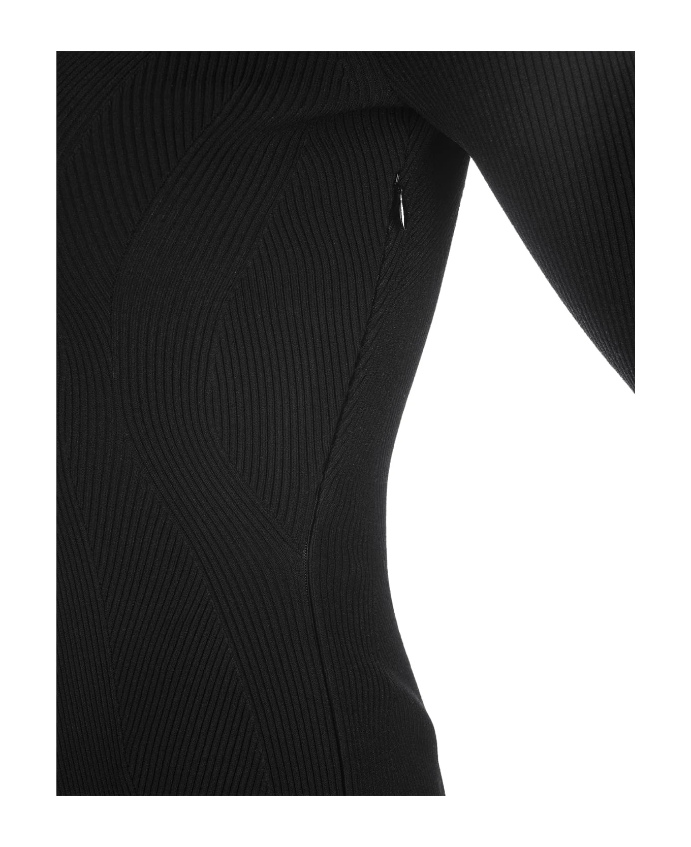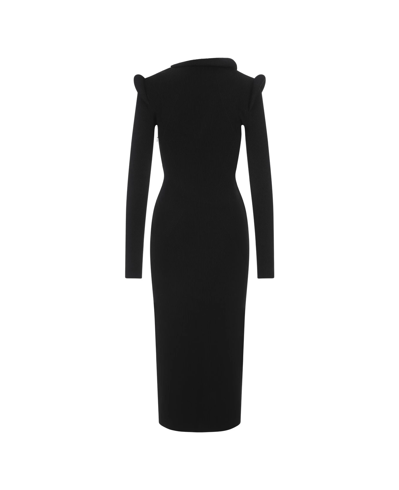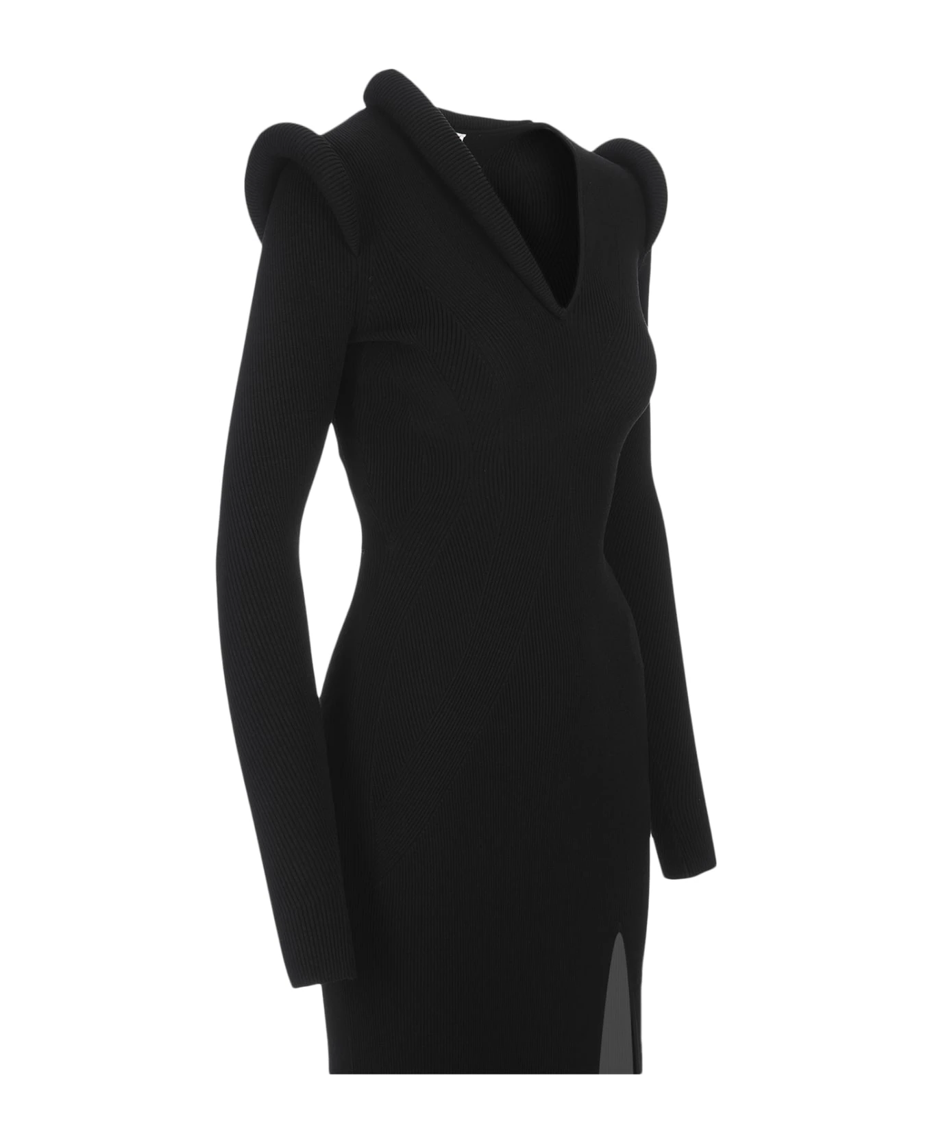 Alexander McQueen midi dress in black ribbed knit featuring a v-neckline, long sleeves, a front slit above the thigh and padded inserts on the neckline and shoulders. Contains certified viscose yarn.