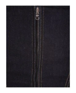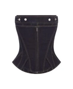 Alexander McQueen sleeveless corset top from blue stretch cotton denim featuring a straight neckline, a curved hem, contrast stitching and a back zip fastening. Metallic details with silver-tone finish.