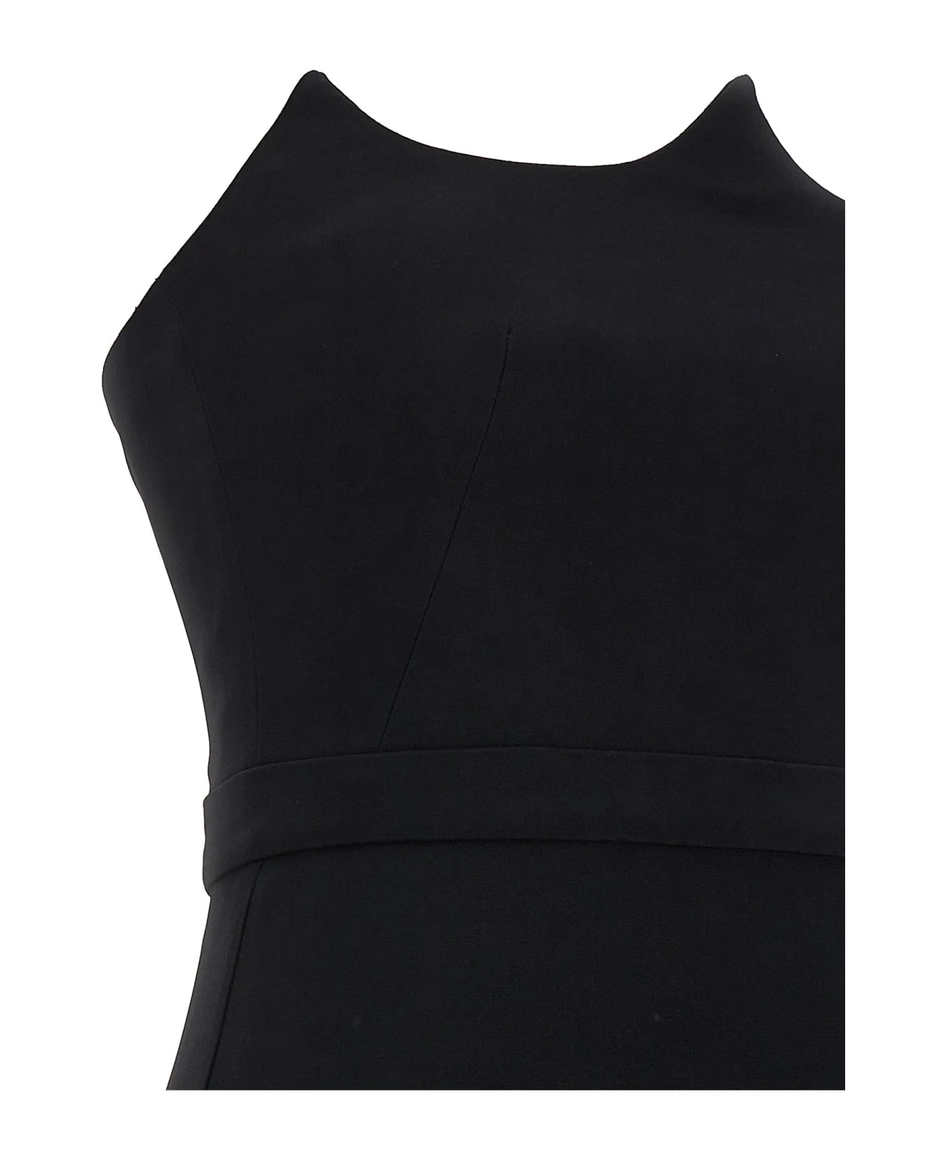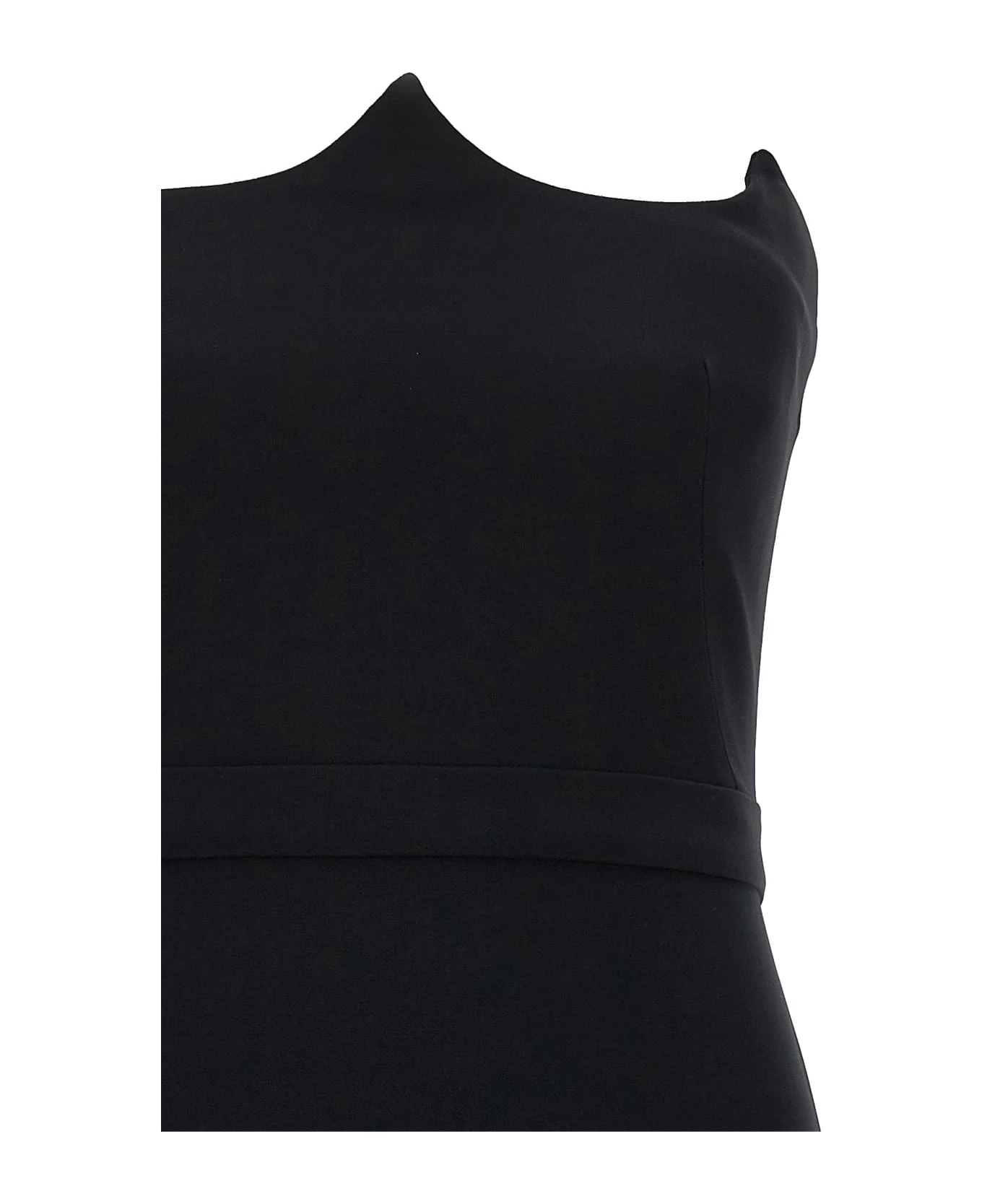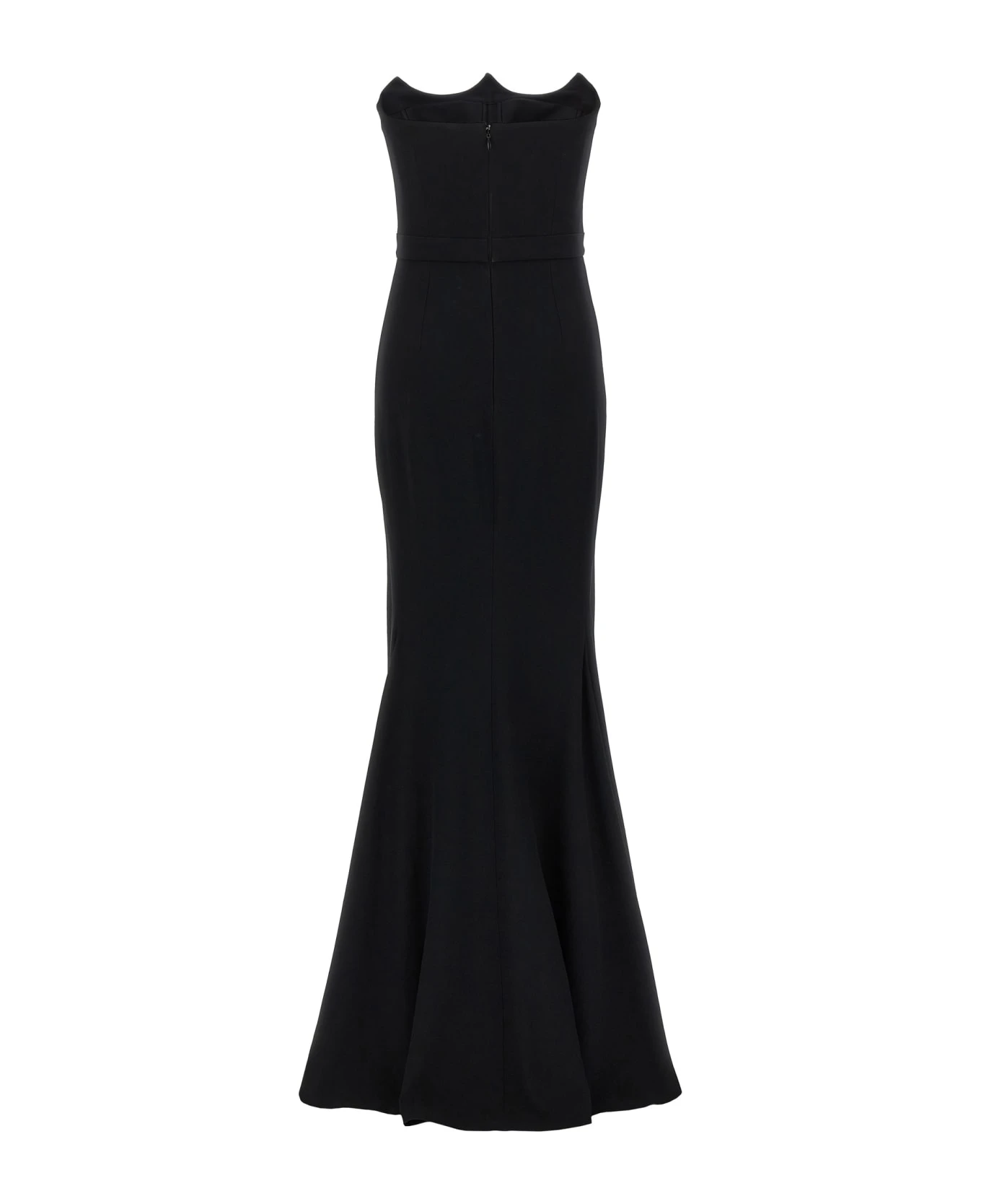 Crêpe dress with pointed corset with integrated cues, off-the-shoulder model, and back zip closure.