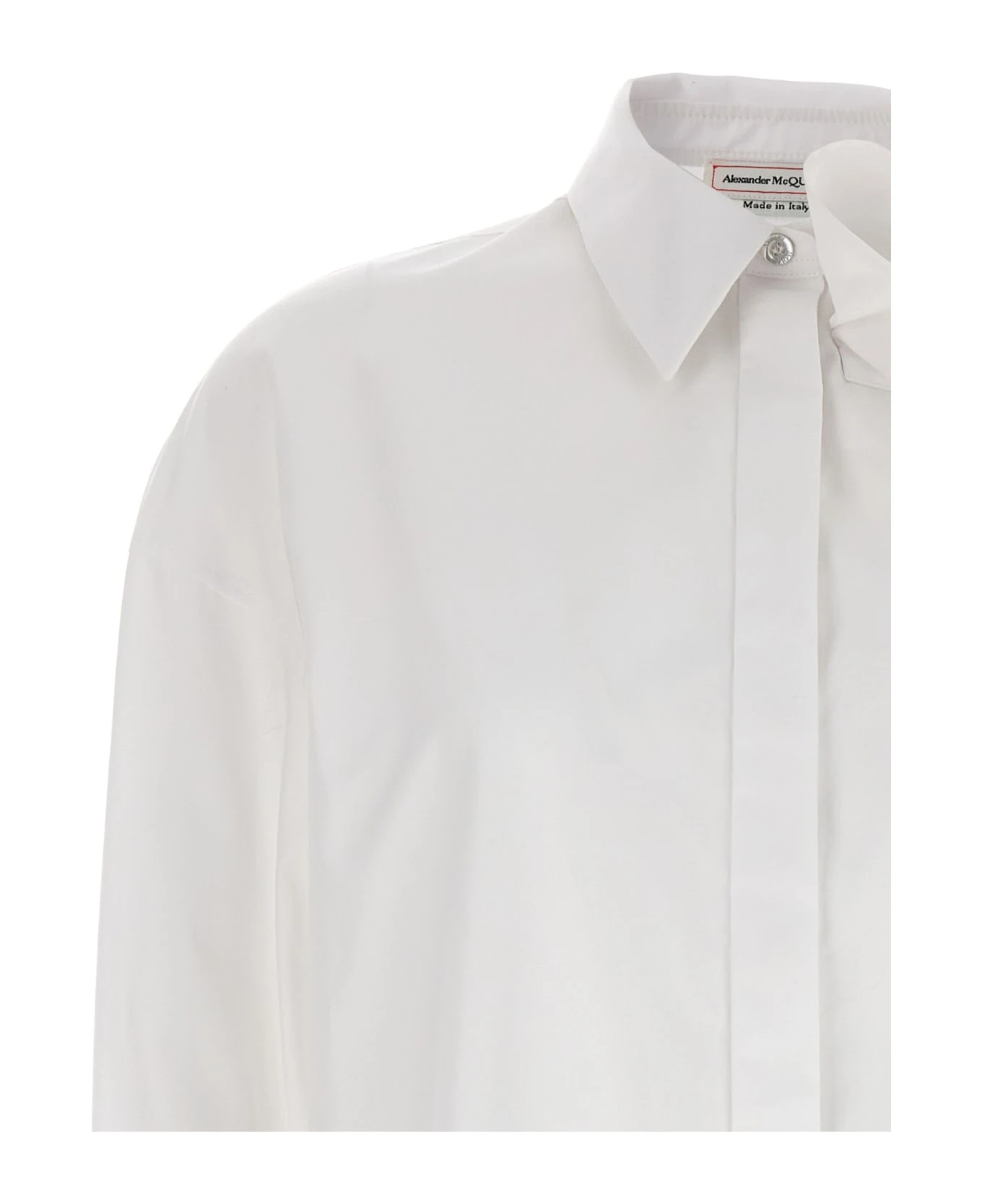 Cotton poplin shirt with draped detail on the collar, button closure, and long cuffed sleeves.