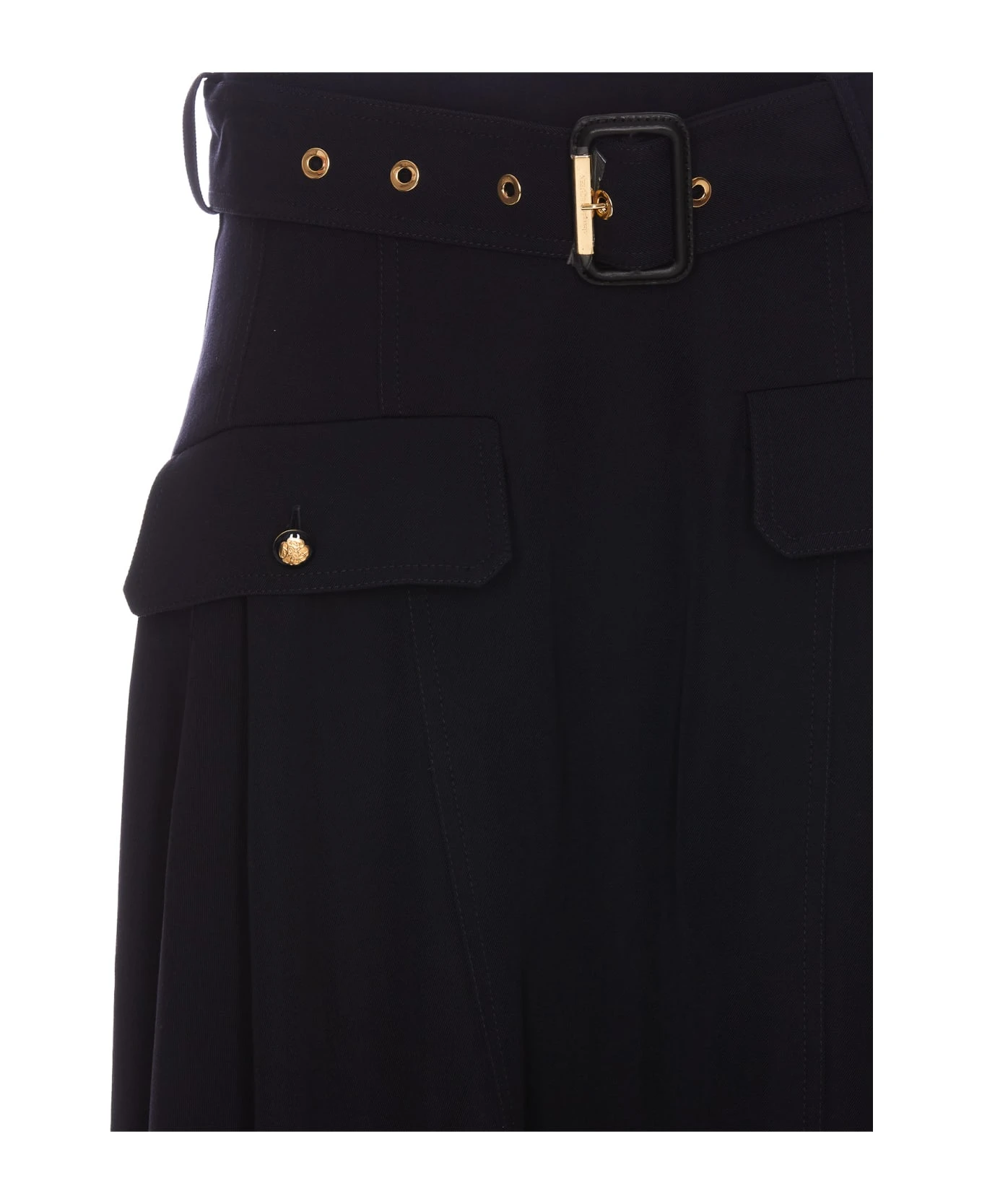Alexander Mcqueen blue long skirt, zip closure on the back, belt closure, high waist, pockets with golden button