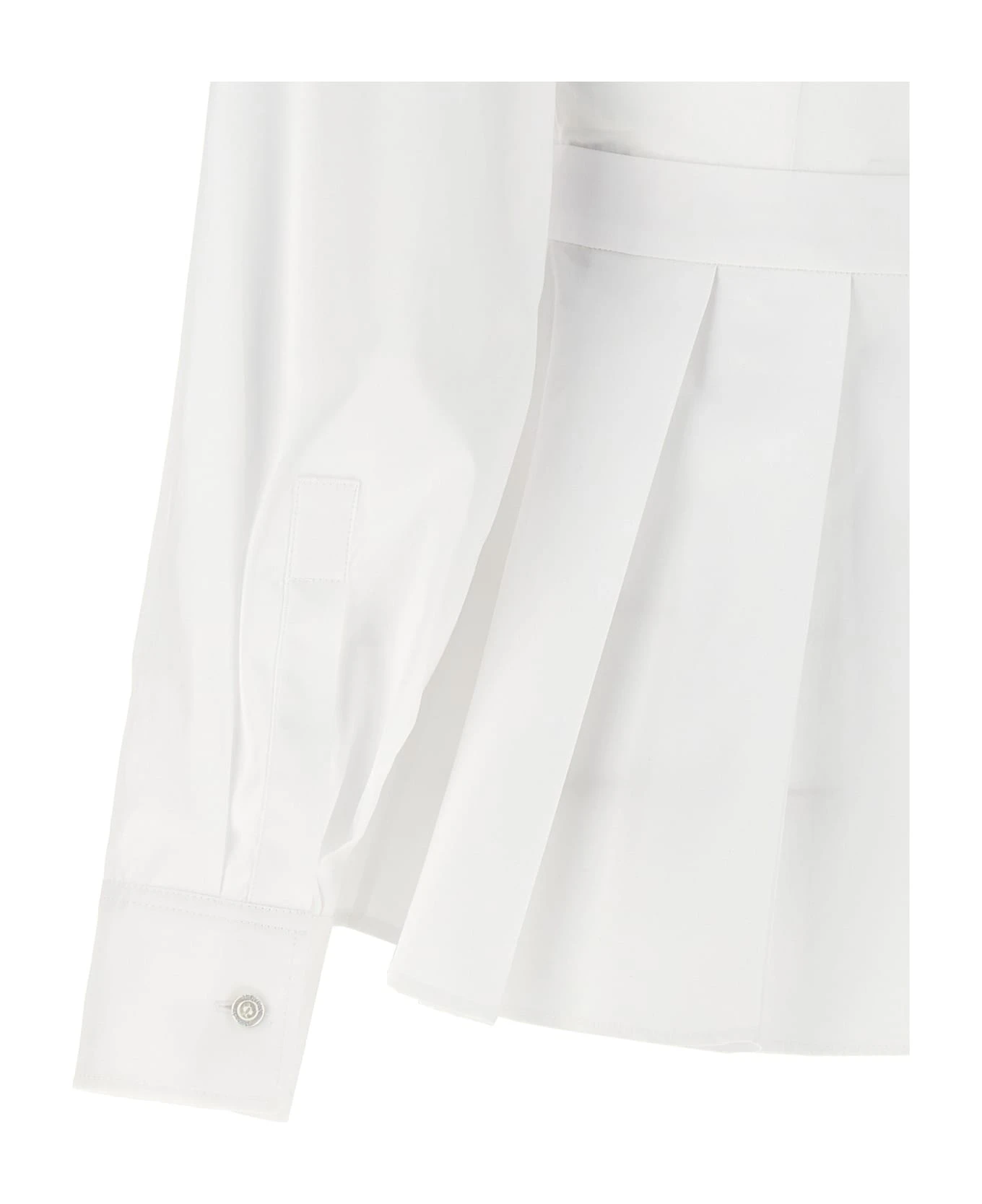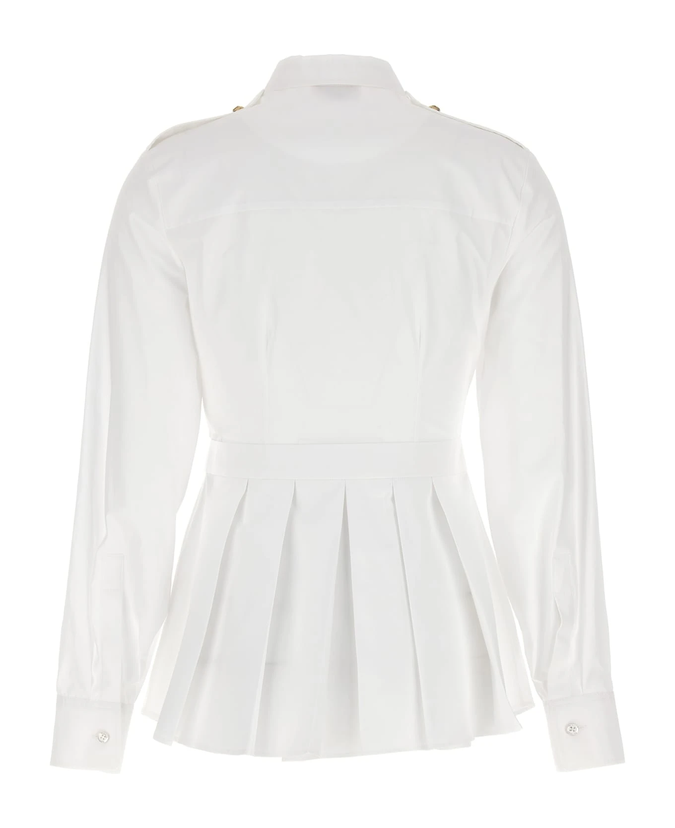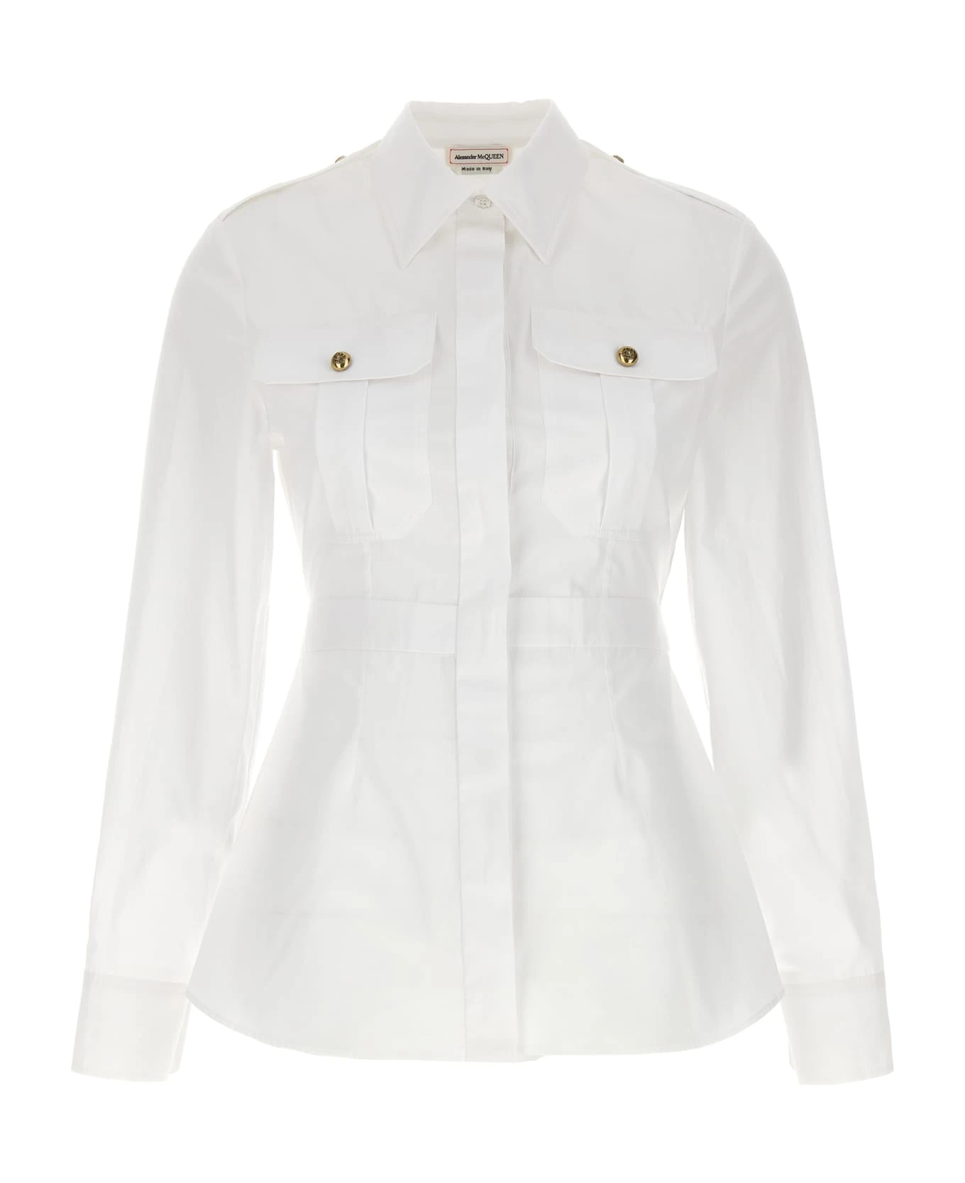Poplin cotton shirt with marked waist and peplum detail, featuring chest pockets with gold buttons and detail on the shoulder.