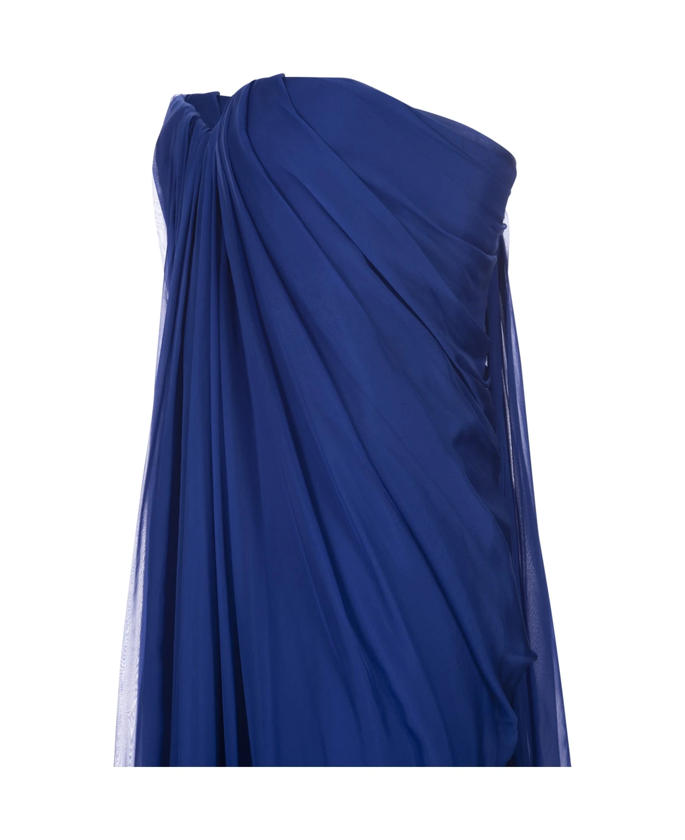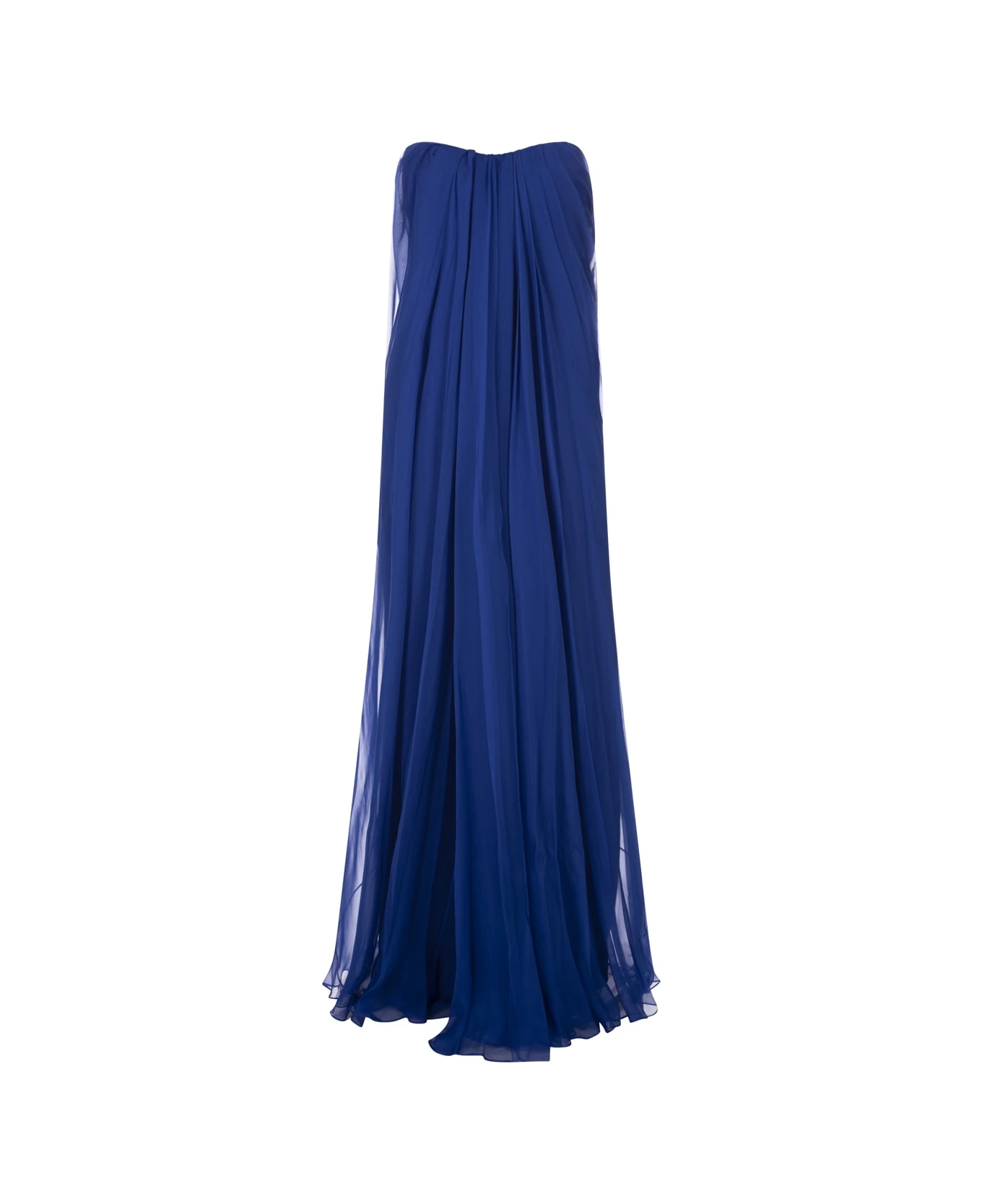 Alexander McQueen long bustier dress in ultramarine blue chiffon with sweetheart neckline and draped details. Back zip fastening. Article made from organic silk yarn.