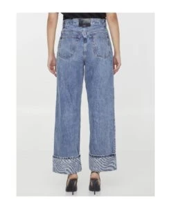 Wide-leg jeans in vintage blue cotton denim with wavy “Alexander Wang” logo printed on turn back cuffs. It features zip and button closure, five-pocket design and black leather patch at the back. Regular fit.