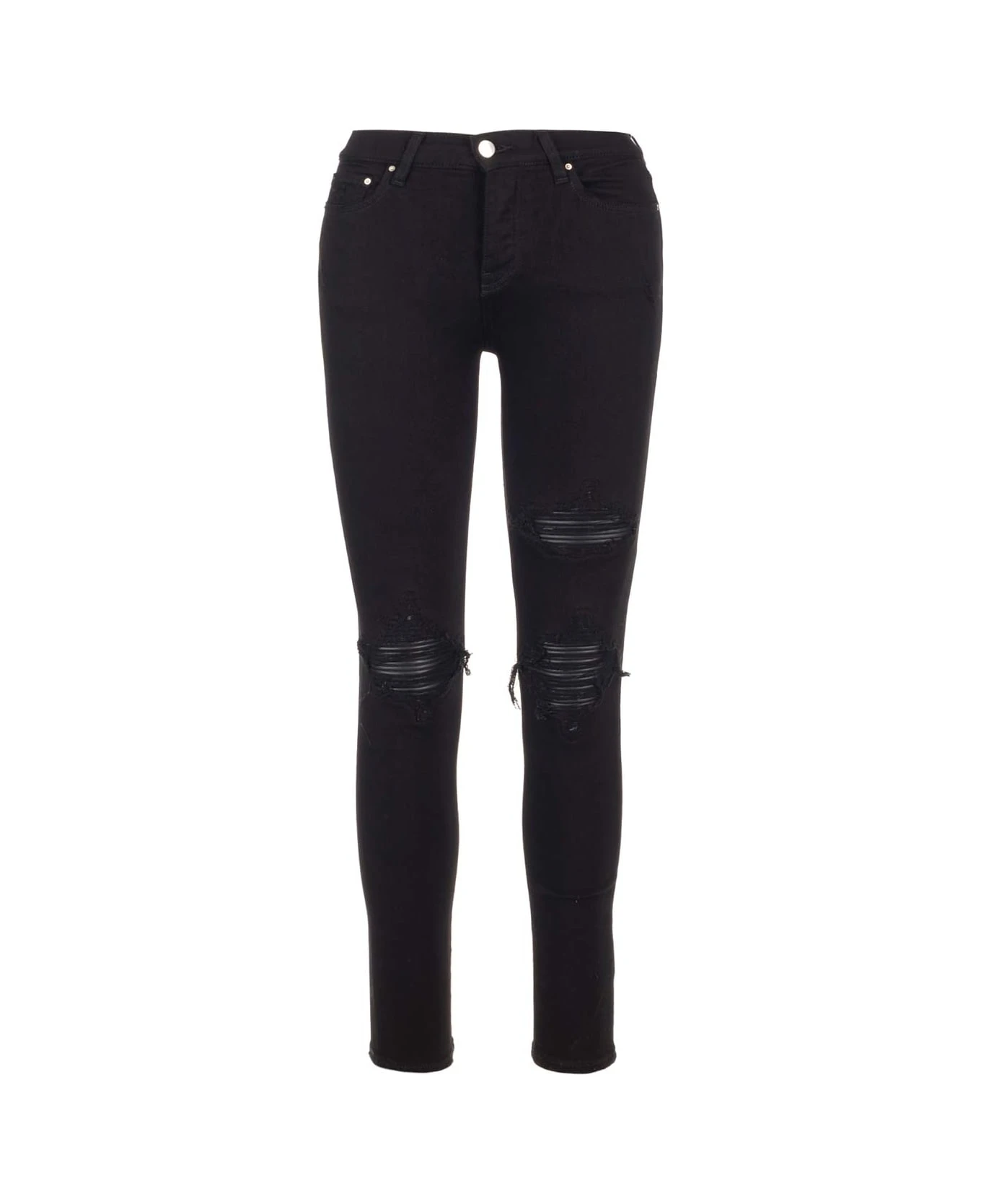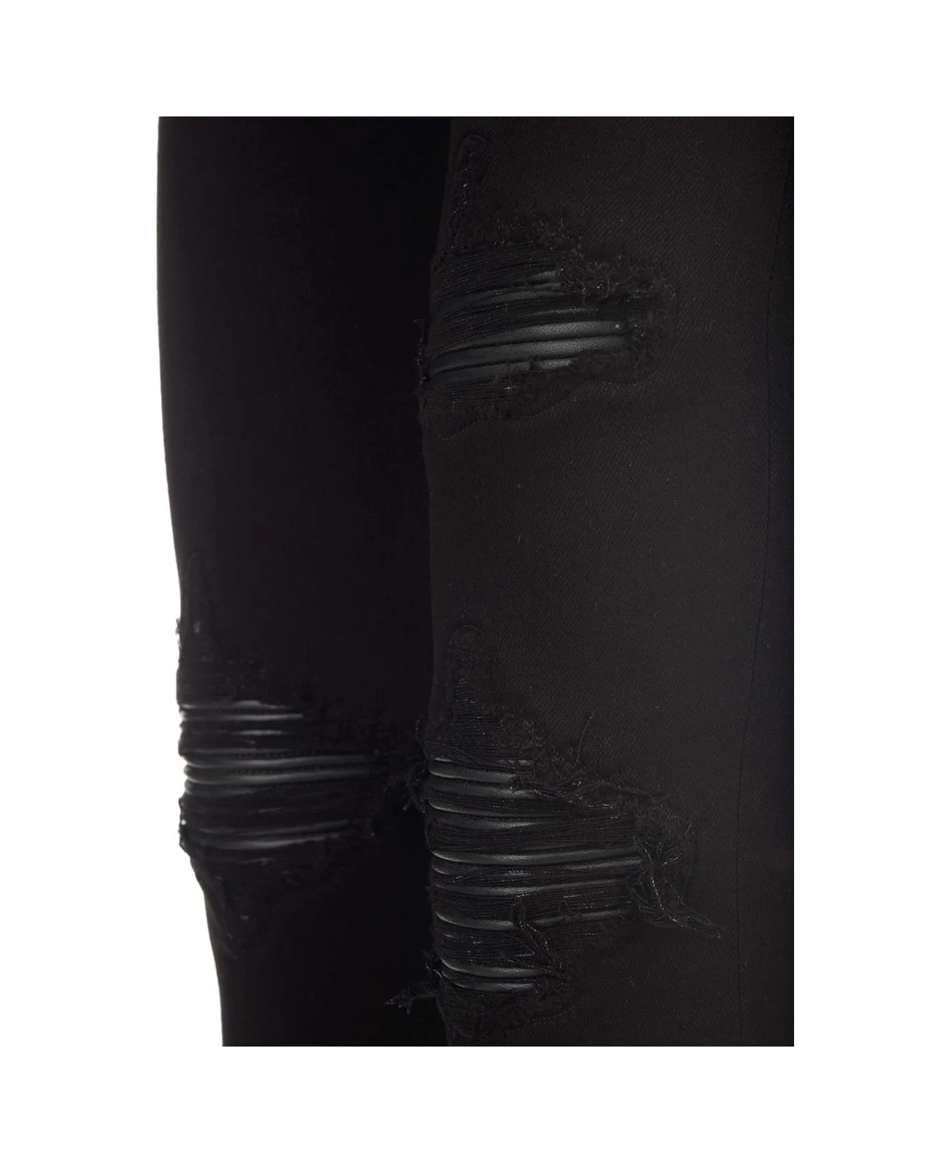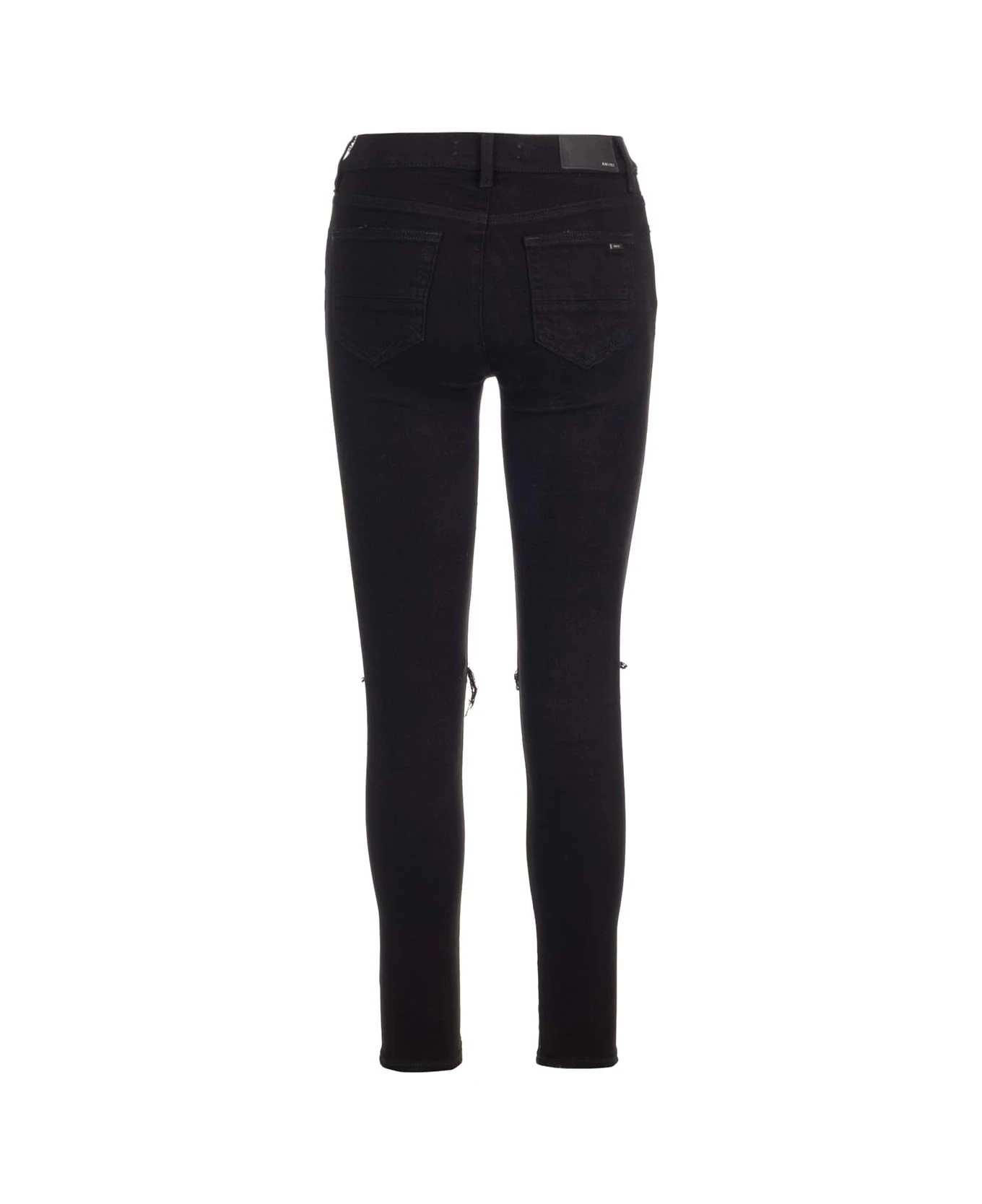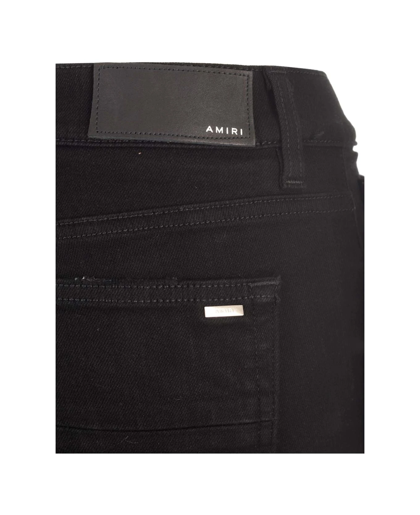 “MX1” skinny jeans from Amiri in black stretch denim, with rips, 5 pocket designs, skinny fit.