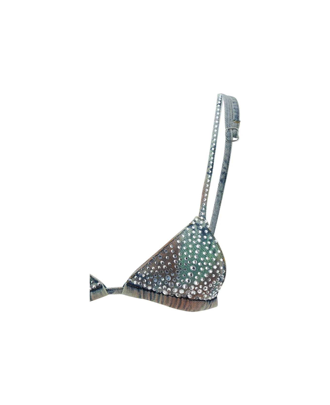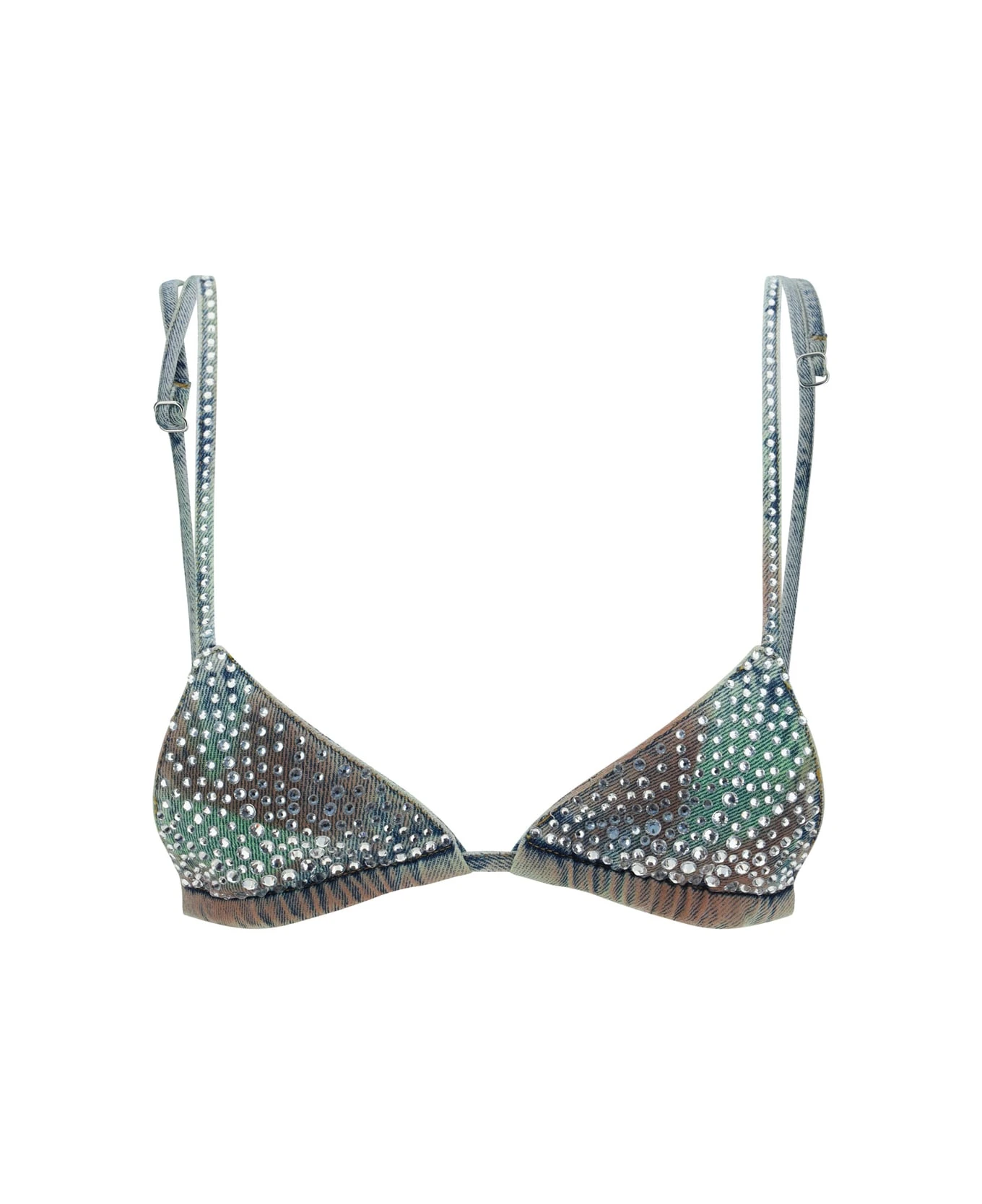 Cotton camouflage bralette by the attico, sliding triangle cups, adjustable thin straps, rusty effect denim design, all-over applied bright rhinestones on cups and straps, regular fit.