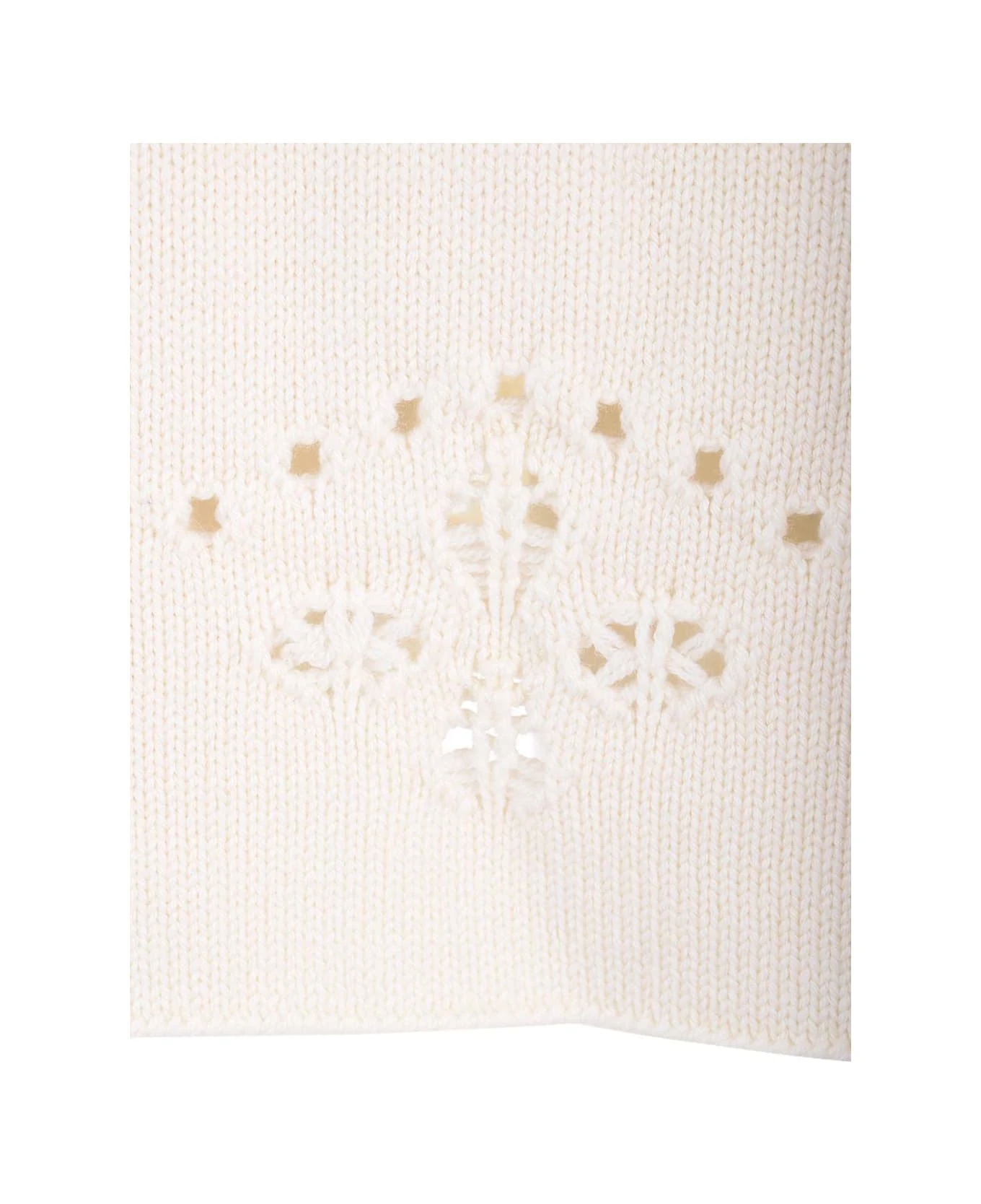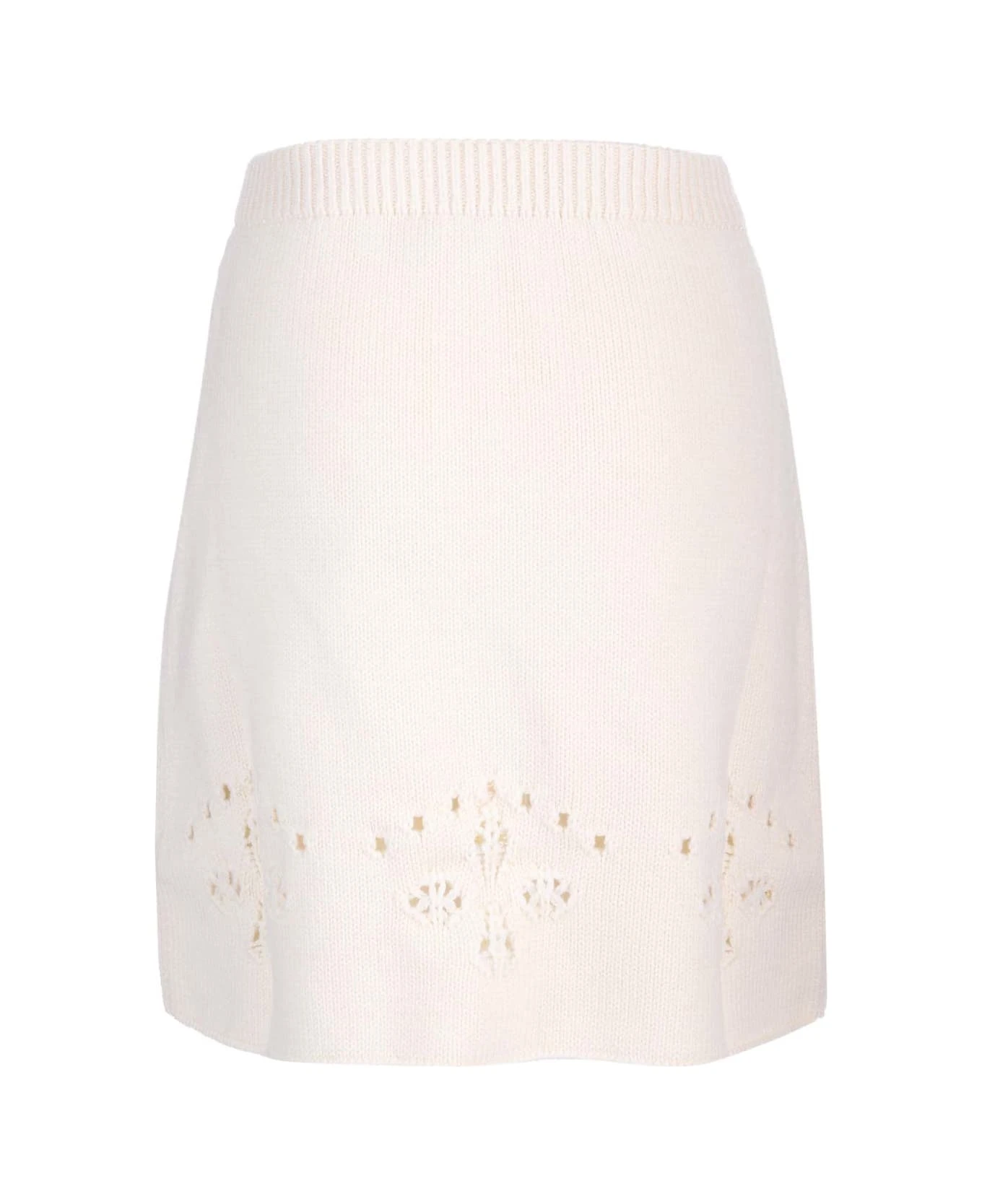 Ivory A-line miniskirt from Chloè in wool, perforated with motifs that recall the iconic wavy details and floral broderie anglaise lace of the Maison, elasticated waist.