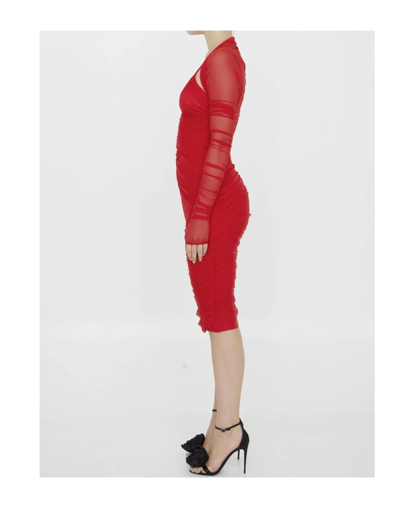 Draped midi dress in red tulle. It features V-neckline and rear zip closure. Tight fit.