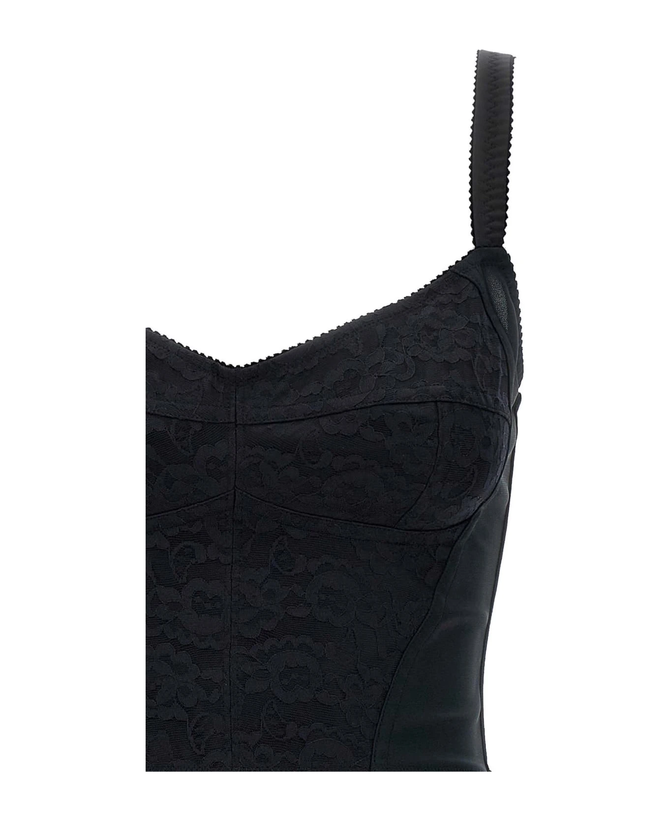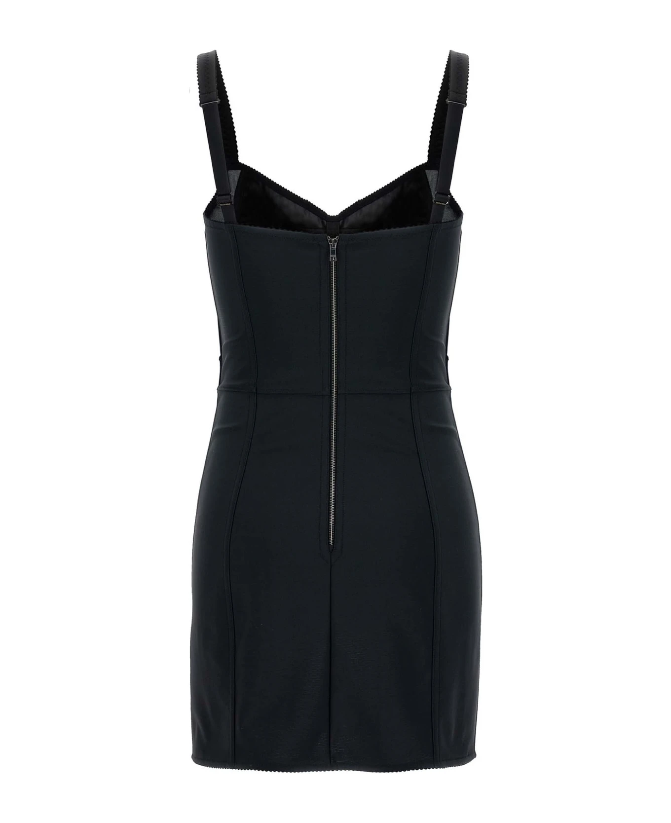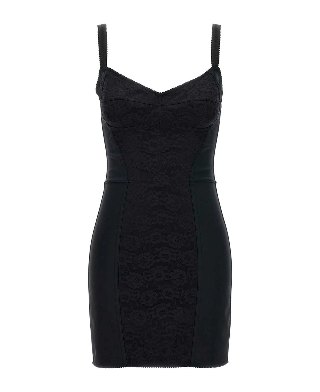 ‘Essential’ corsetry petticoat dress in technical fabric and lace, adjustable straps, and back zip and hook closure.