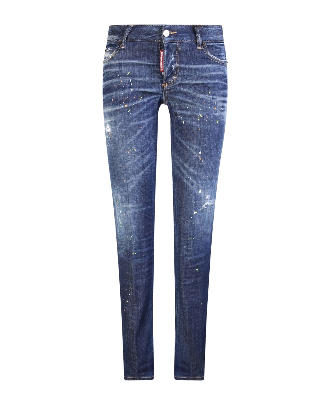 Mid rise. Front button and zip fastening. Belt loops. Classic five pockets. Logo tag. Logo patch to the rear. Paint splatter detail. Cropped design. Color: blue