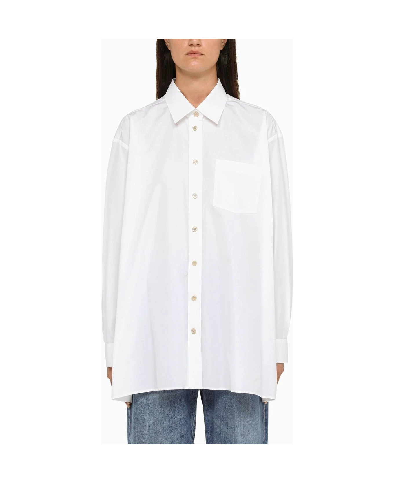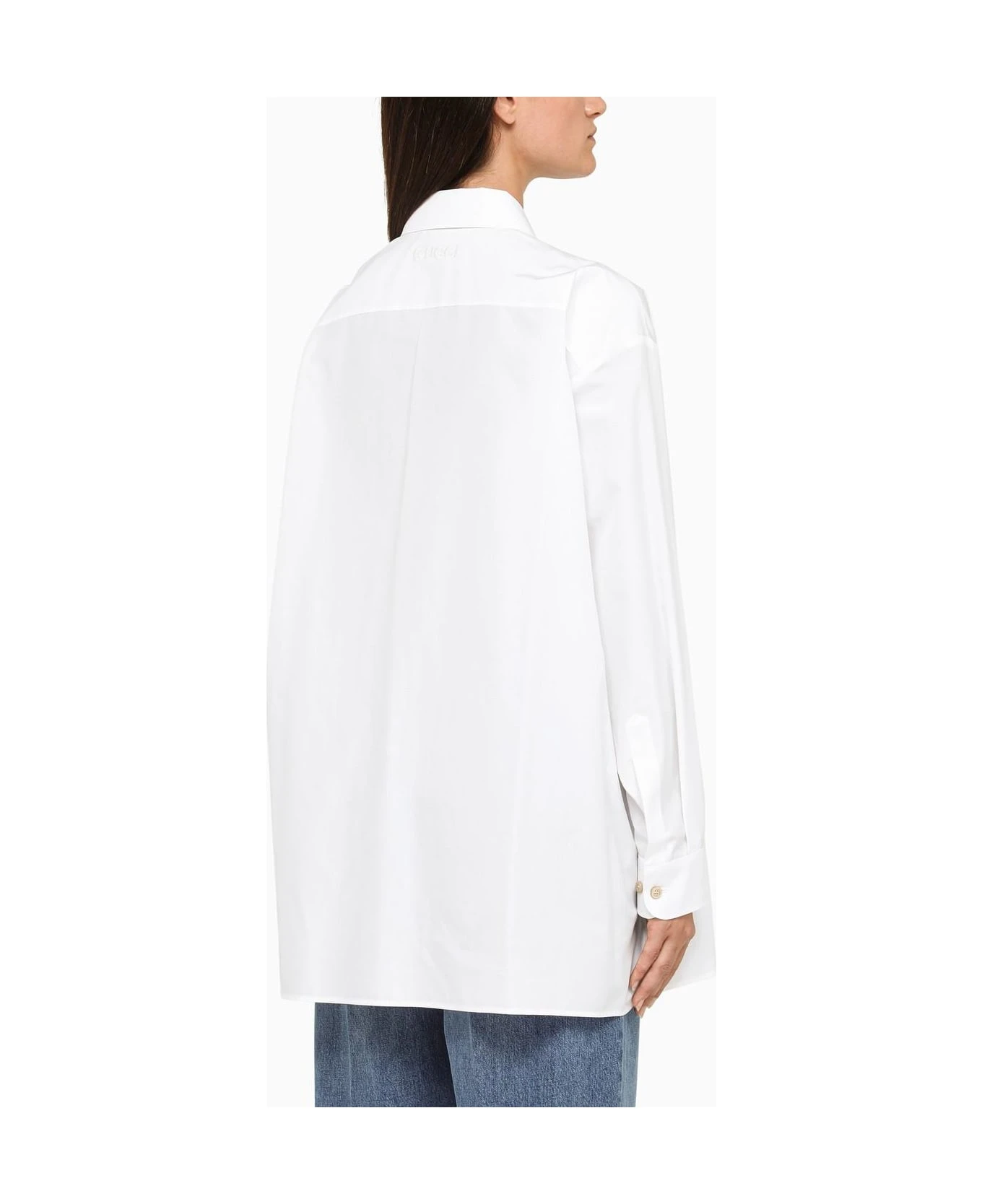 White cotton poplin oversized shirt from Gucci featuring a front button fastening, a chest pocket and a rounded hem. Model with embroidered logo to the back.