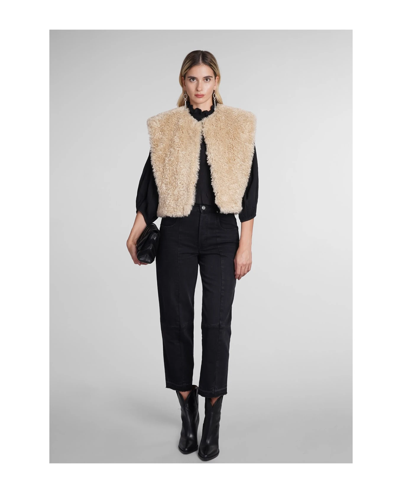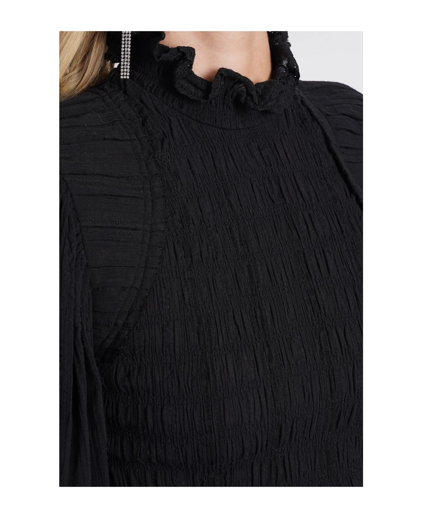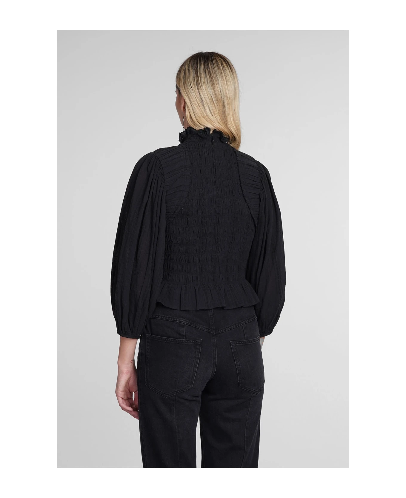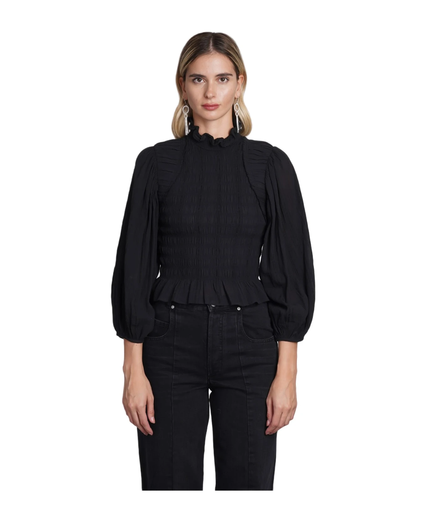 Idris Blouse in black cotton, ruffle neck, zip clousure, Puff sleeve, pleated design, 90% cotton, 10% viscose, Made in India, Model is 180 cm and wears 36