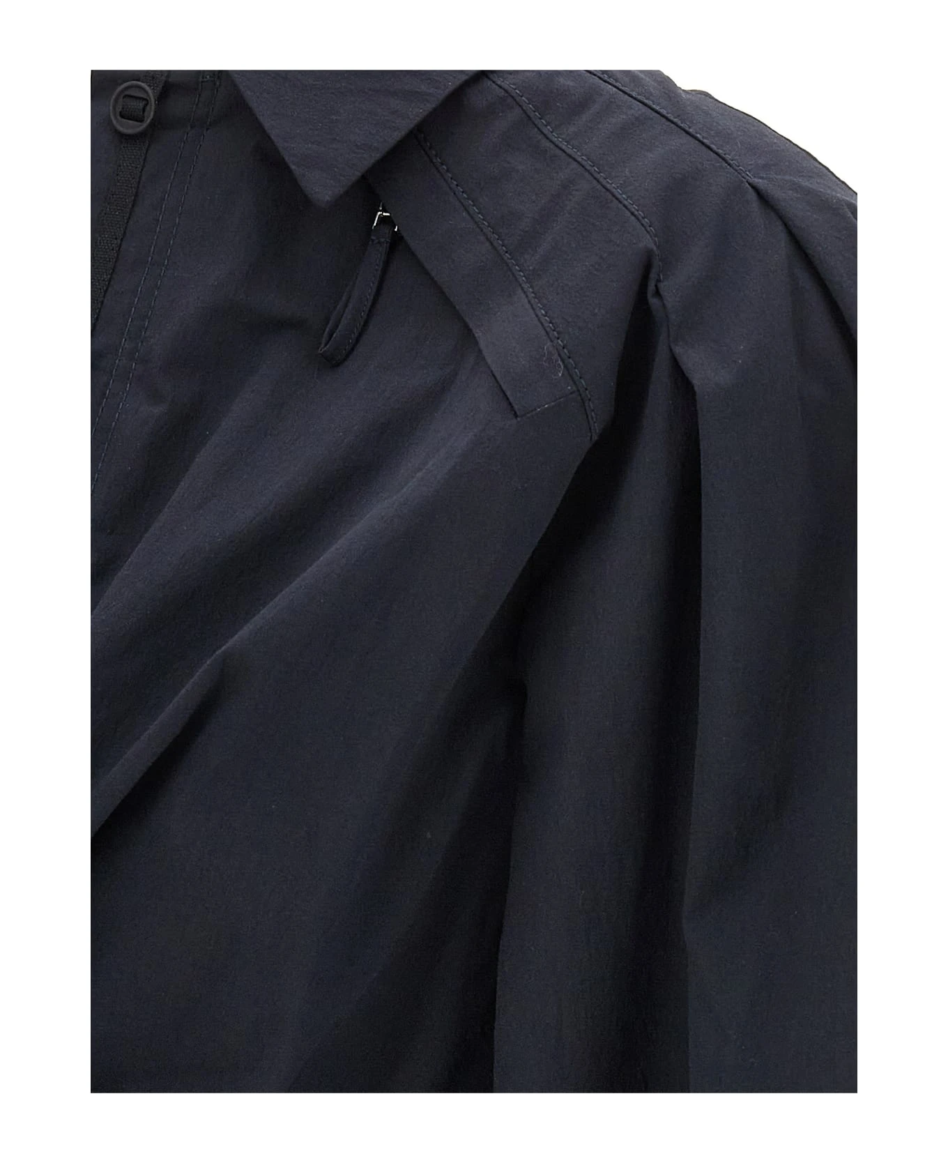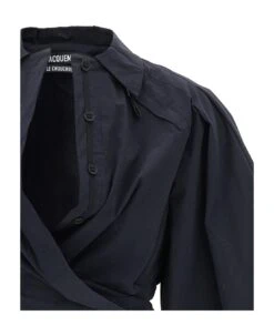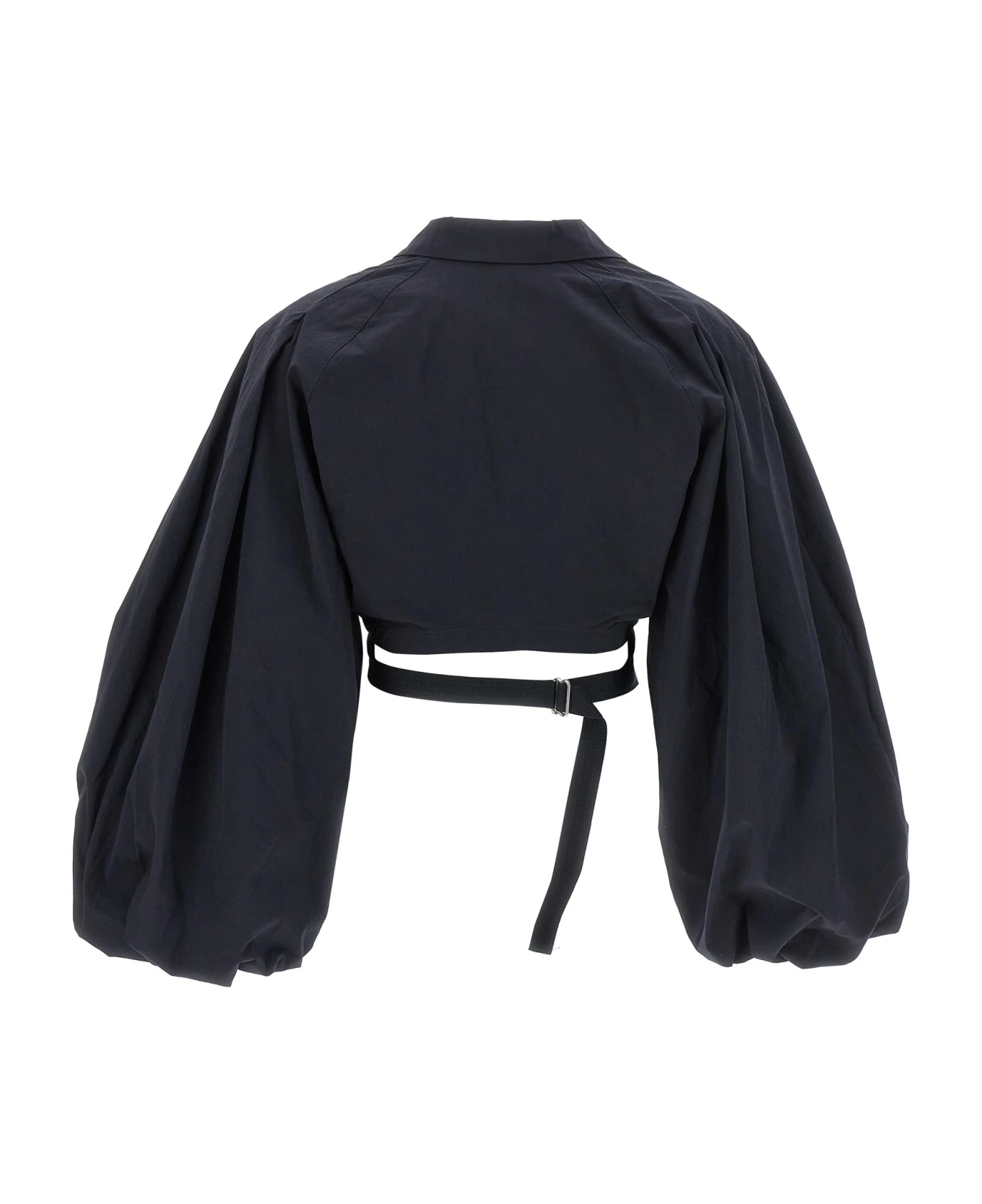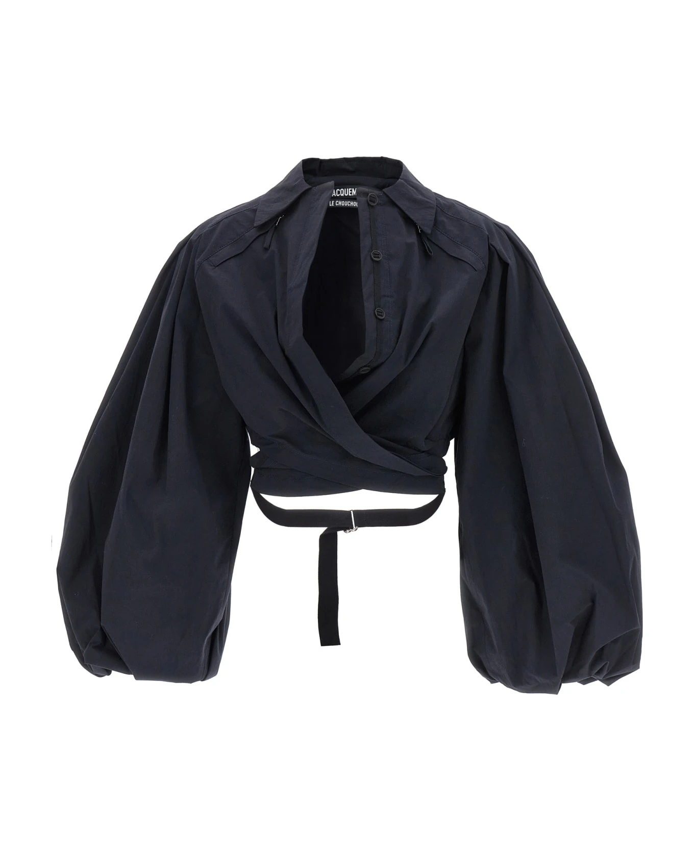 ‘Le haut bahia boule’ stretch cotton shirt with maxi puff sleeves, front crossover on the waist adjustable at the back, maxi V-neck with buttons, shirt collar with zip detail underneath.