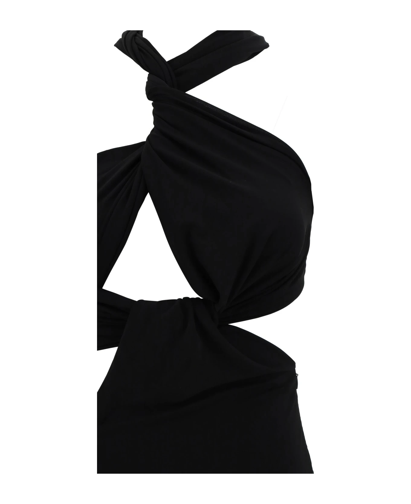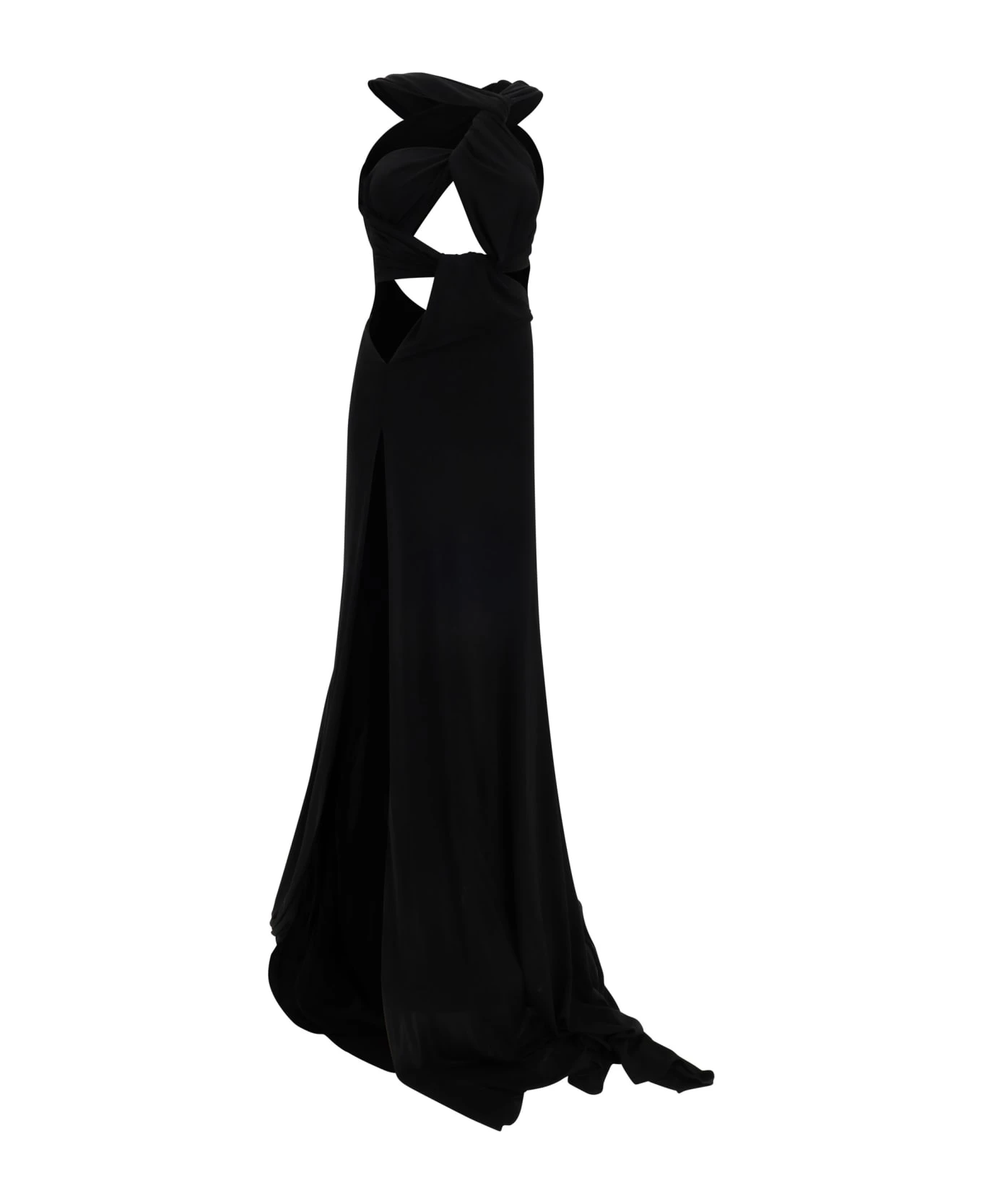 Long dara dress by the attico, front and back criss-cross design, criss-cross neckline, cut-out detail on front neckline, monochrome pattern, wide front slit, geometric cut-out detail on right hip, floor-length design, skirt with wide train, regular fit.