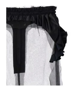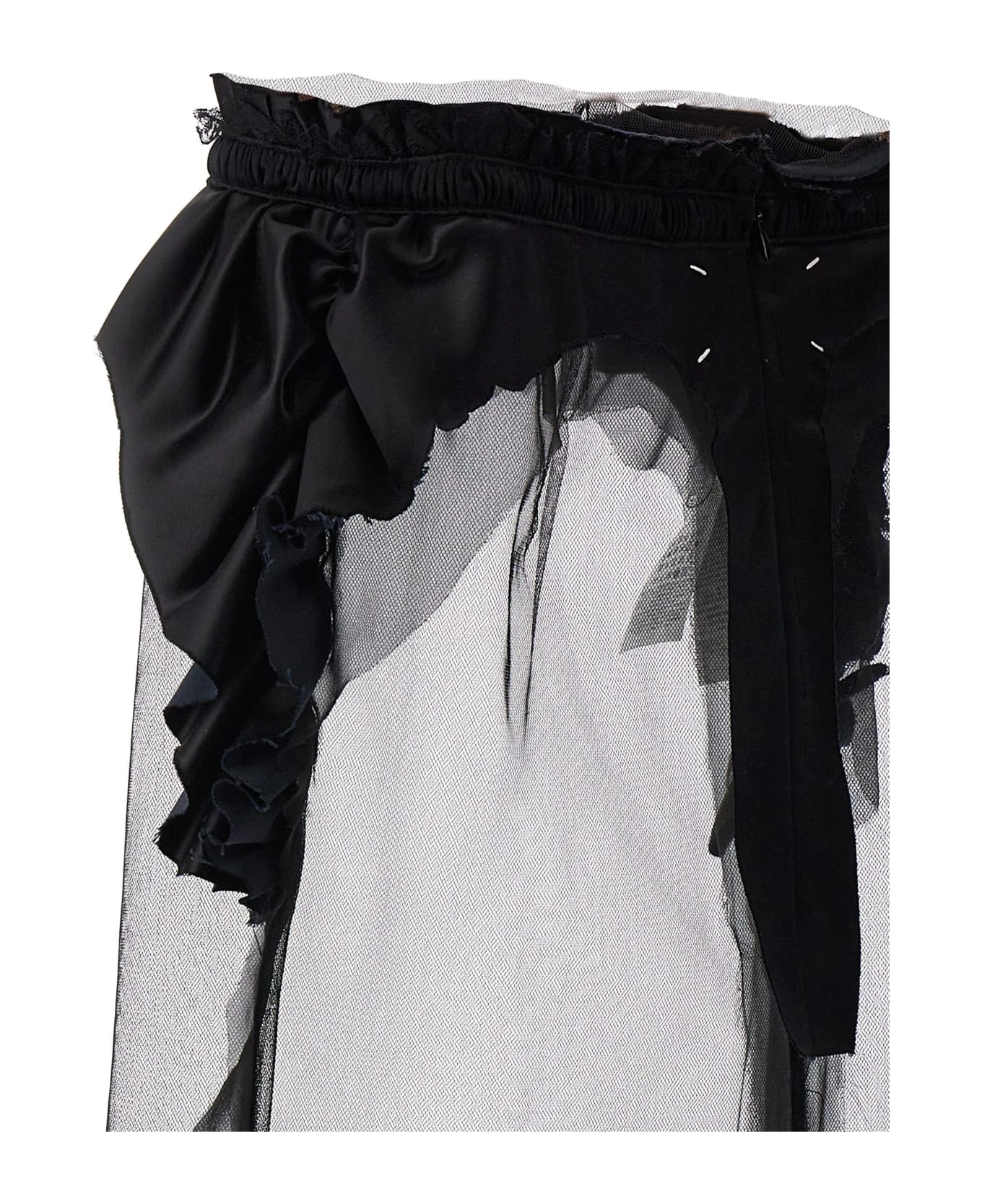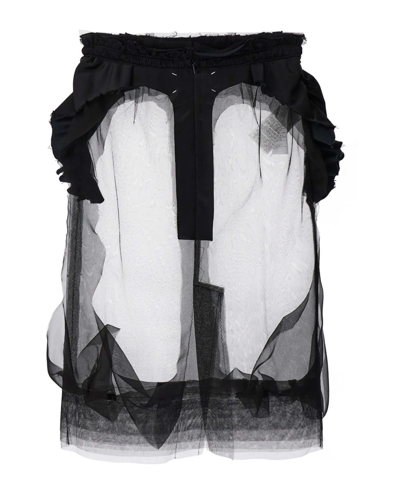 Transparent tulle skirt with satin ruches, elastic waistband and a back zipper closure.