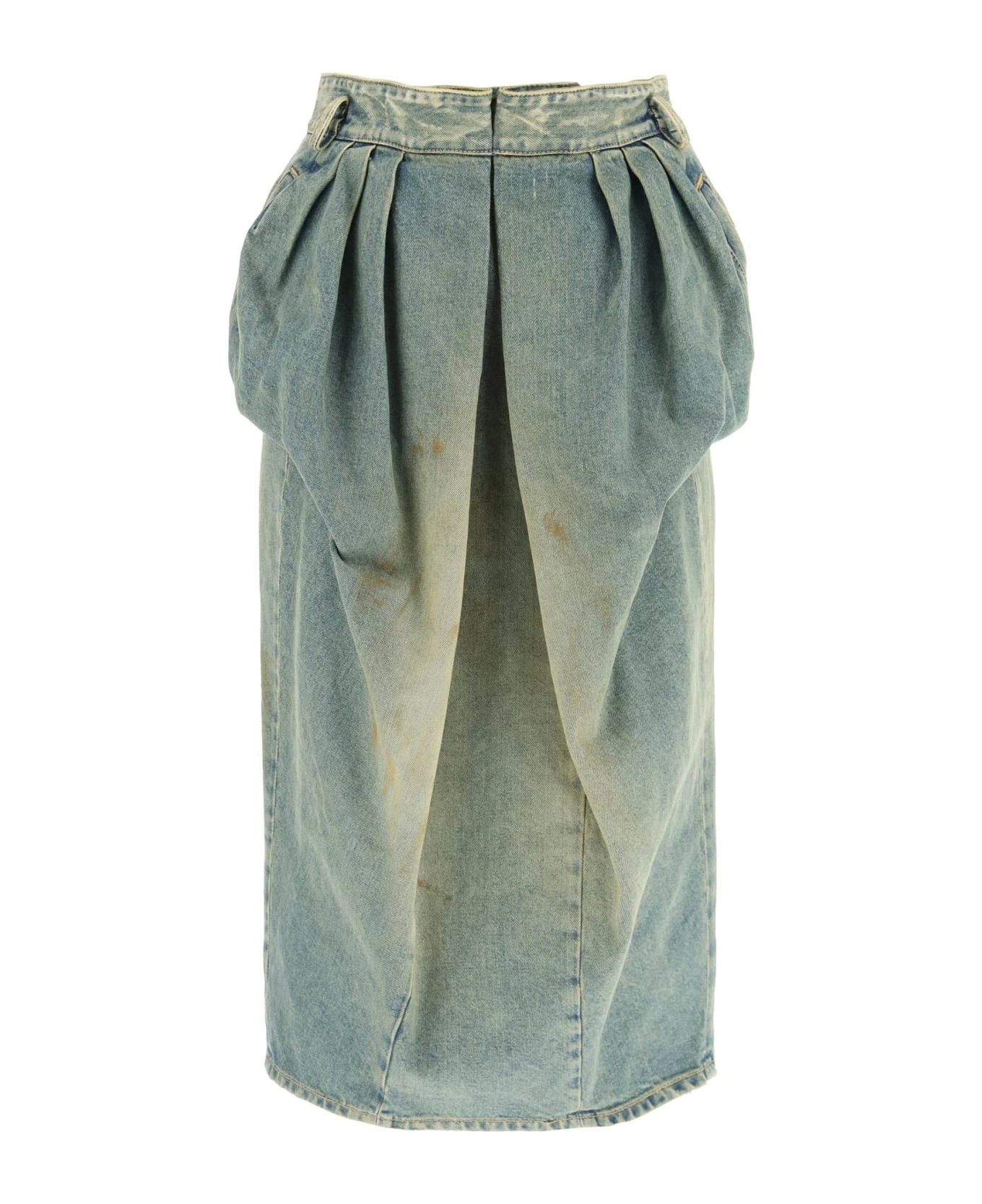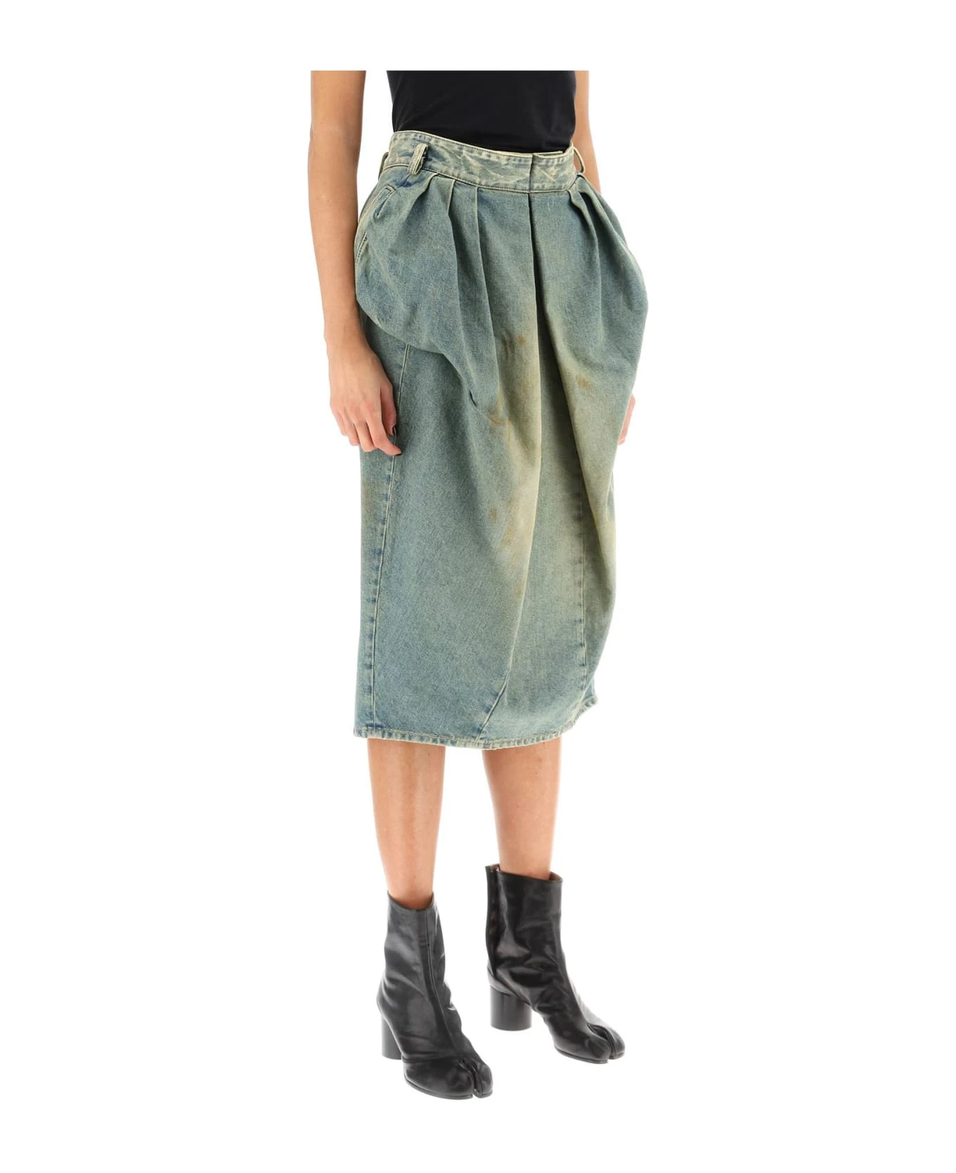 Midi pencil skirt by Maison Margiela, crafted in worn-out effect cotton denim. Design featuring two front darts, puffed details on the hips, side slanted pockets, rear center slit and invisible zip and hook fastening on the back. Finished with the signature four-stitches monicker at back of the waist. The model is 177 cm tall and wears a size IT 42.