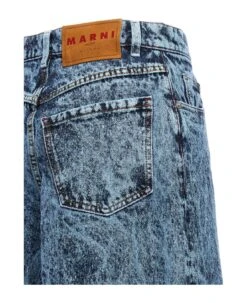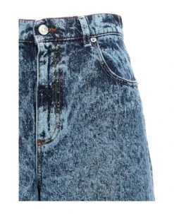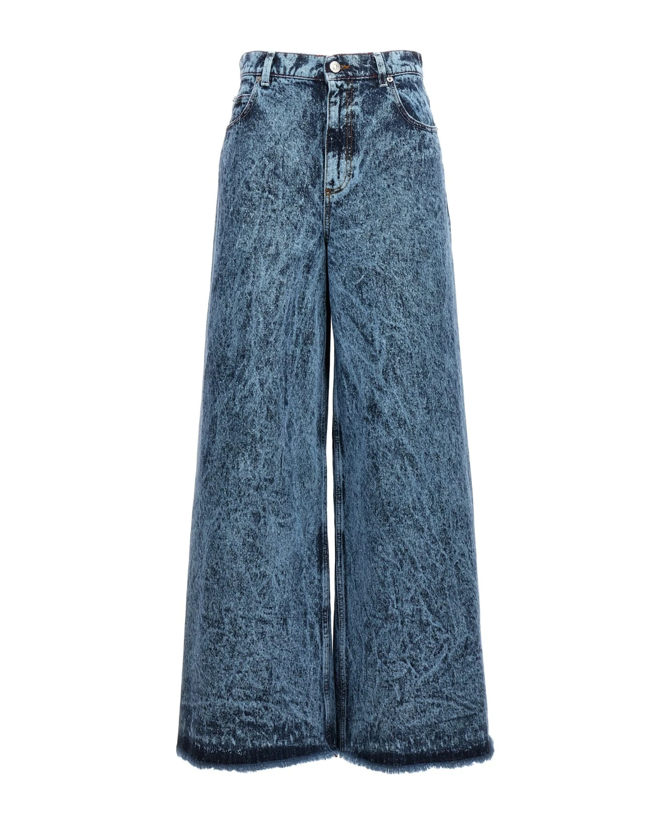 Marbled cotton denim jeans with zip and button closure, five pockets, wide flared leg, frayed raw cut hem, suede logo tag.