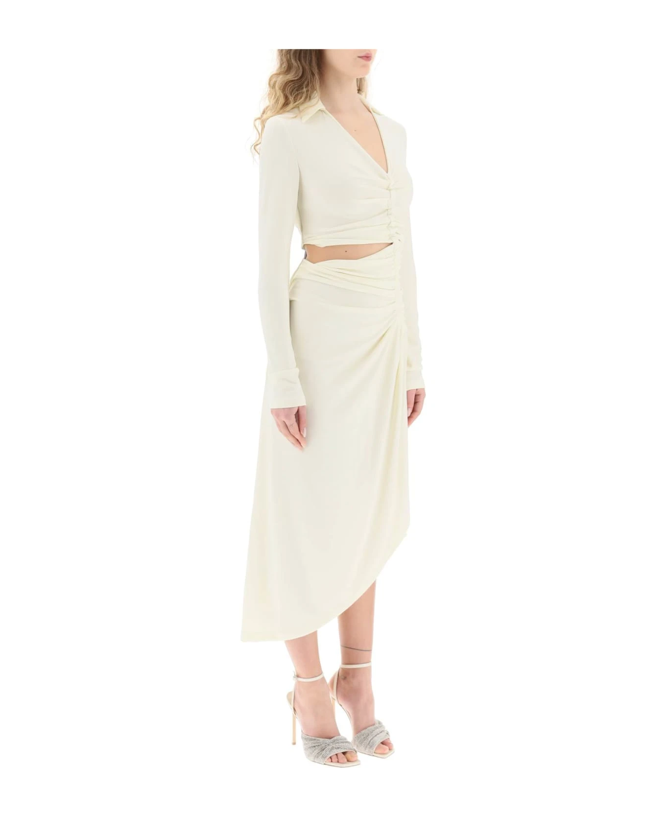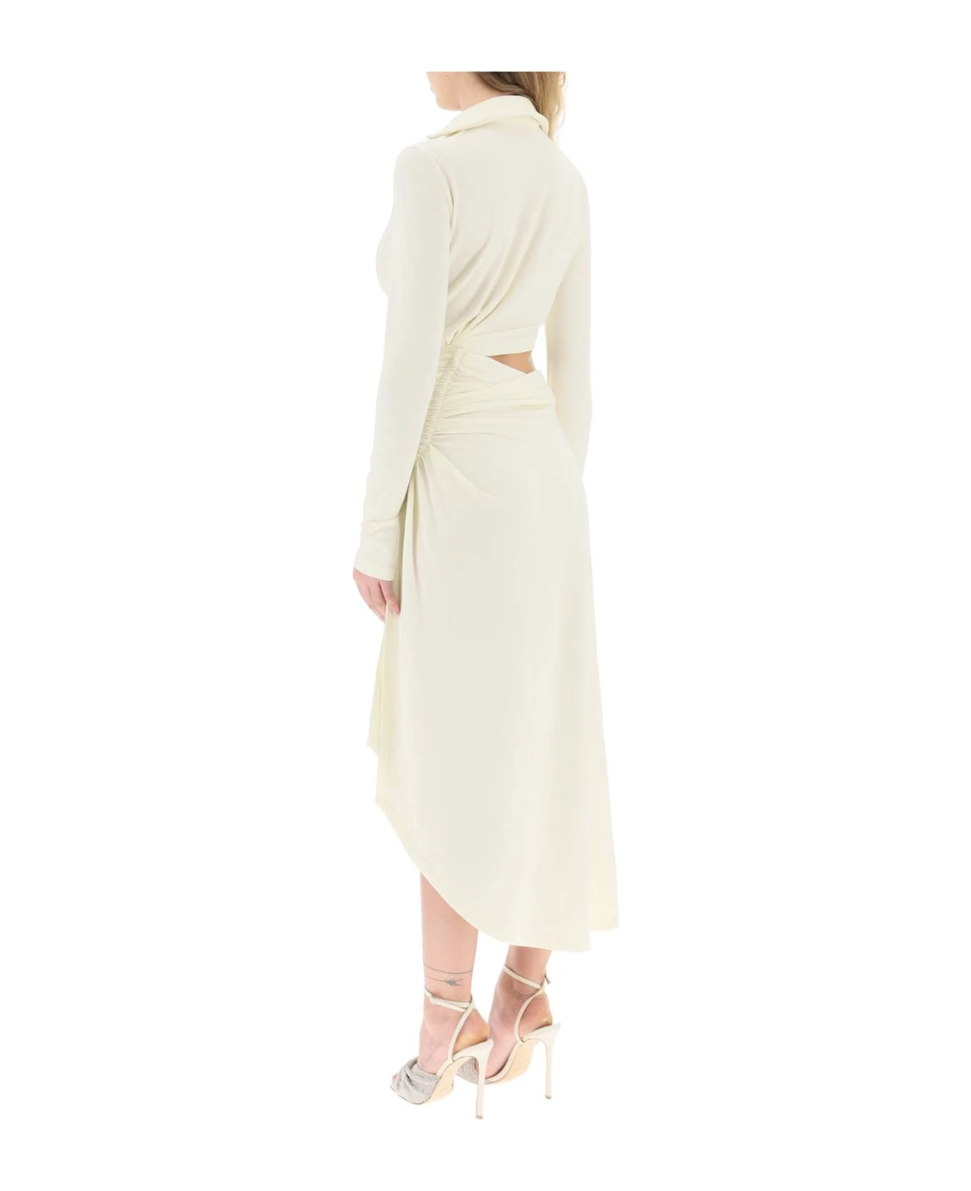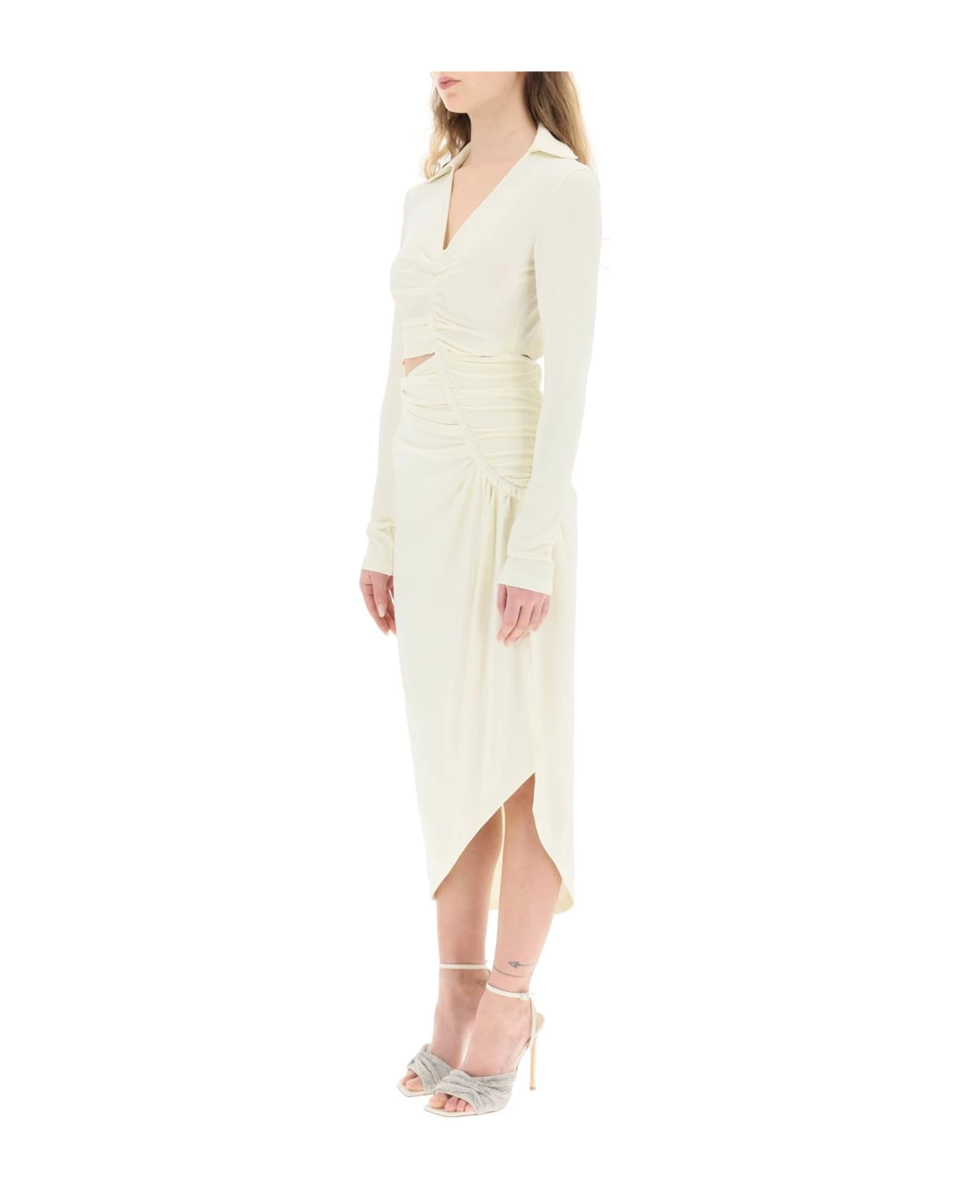 Off-White long-sleeved dress in viscose jersey, boasting an asymmetric ruched design with cut-out detailing at the waist and a side slit. The deep V-neck is finished with a polo-style collar. The model is 177 cm tall and wears a size IT 38.