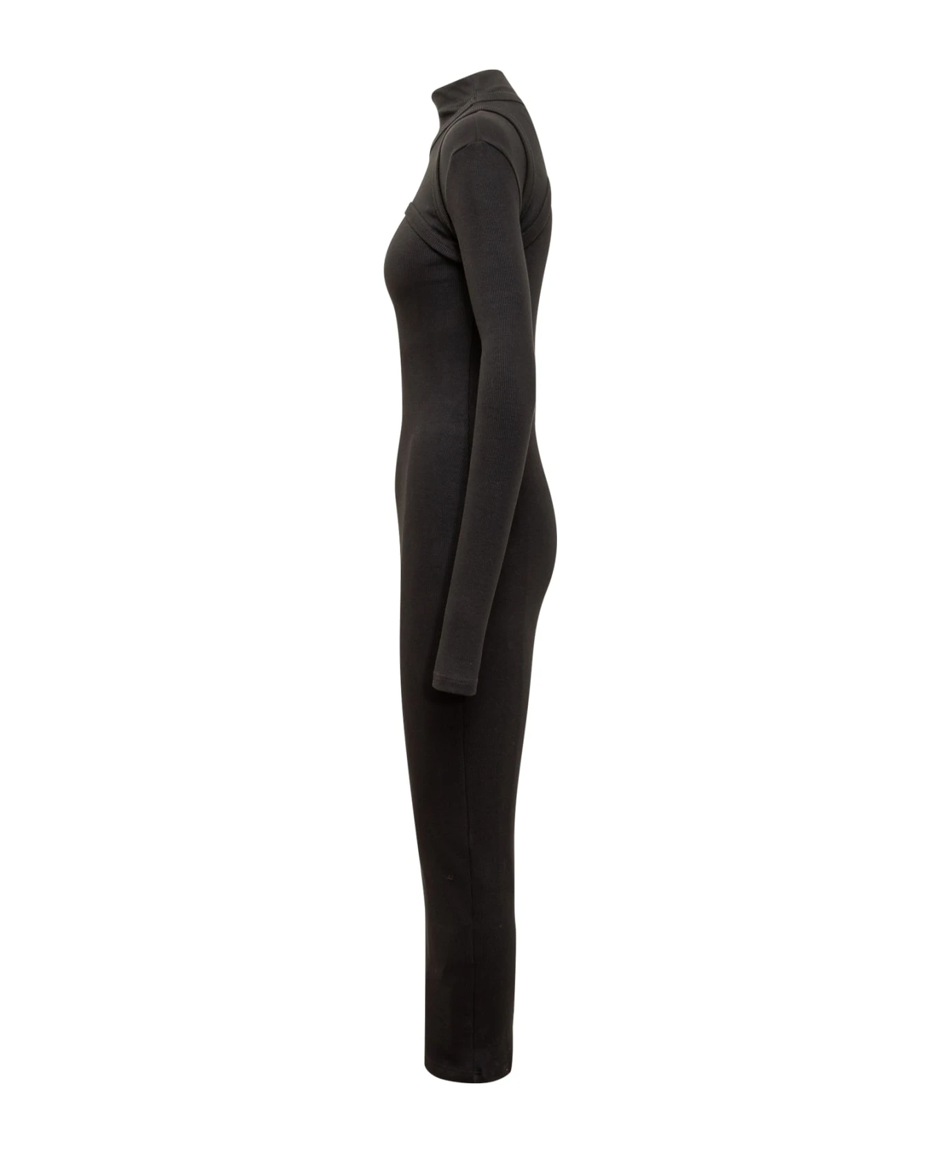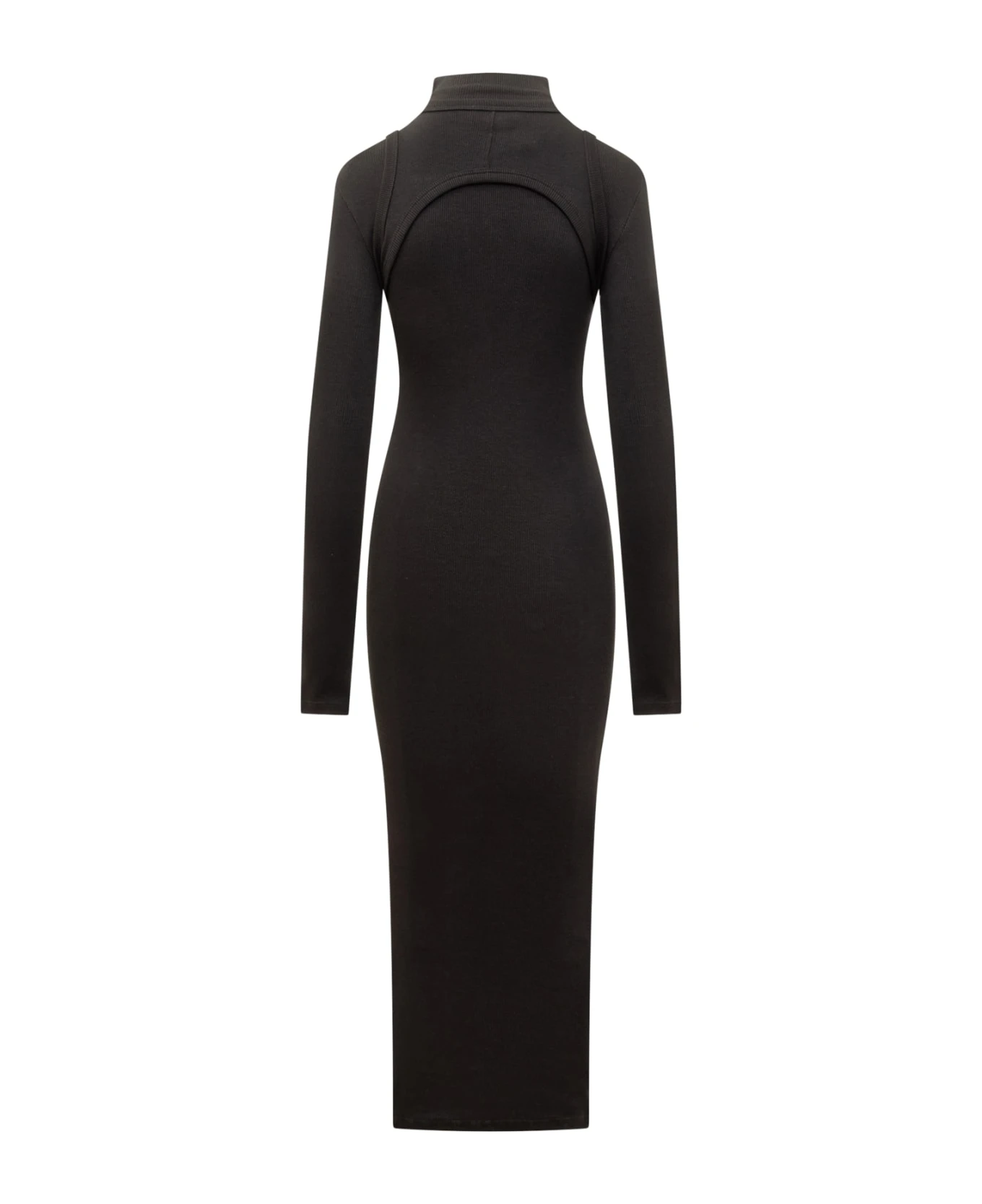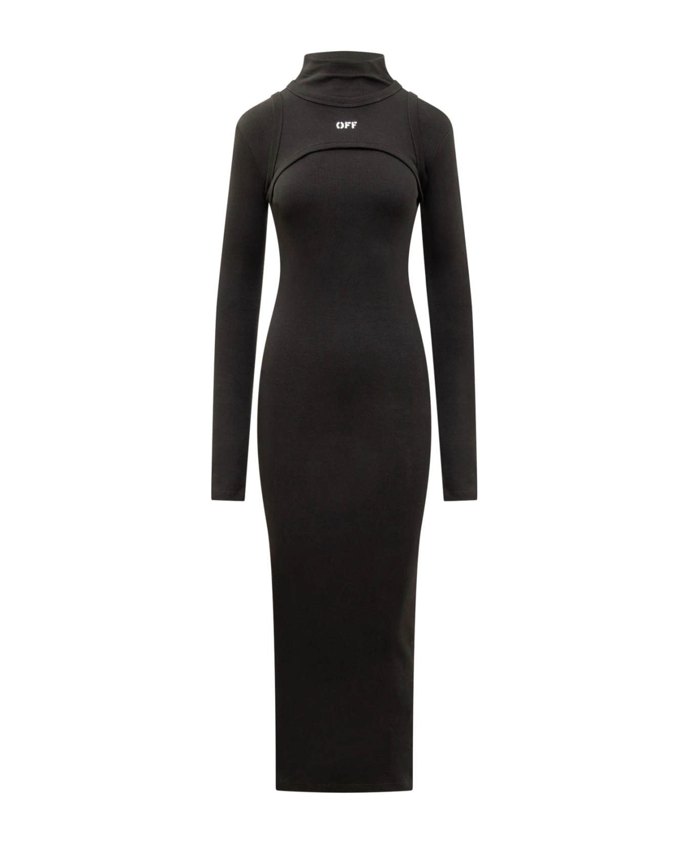 Long ribbed dress. Long sleeves. High neck. Logo printed on the front.