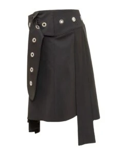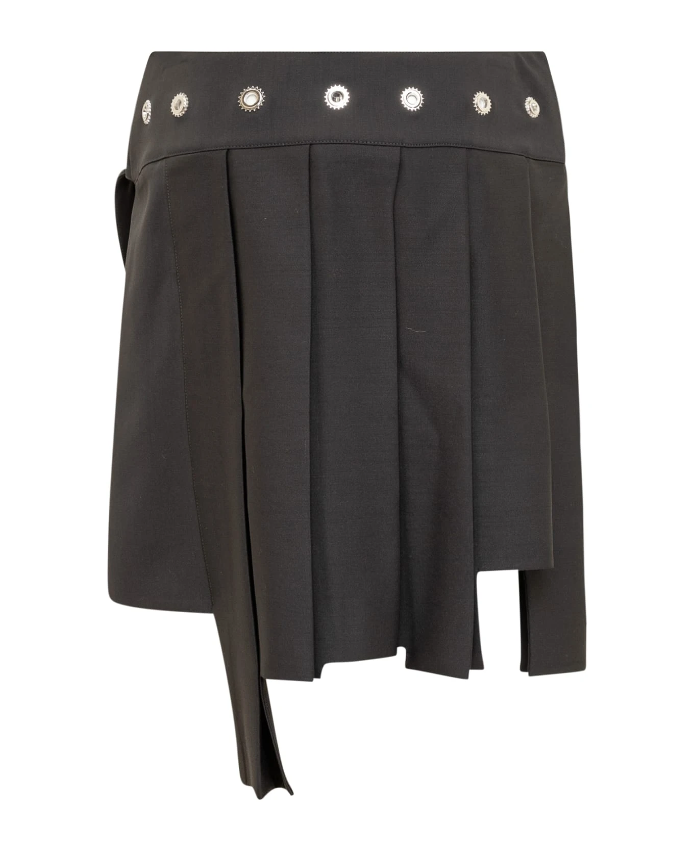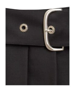 Black pleated mini skirt. Button closure and maxi belt. Belt hole details with notches. Asymmetrical structure.