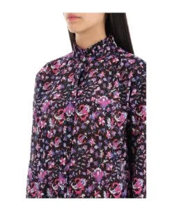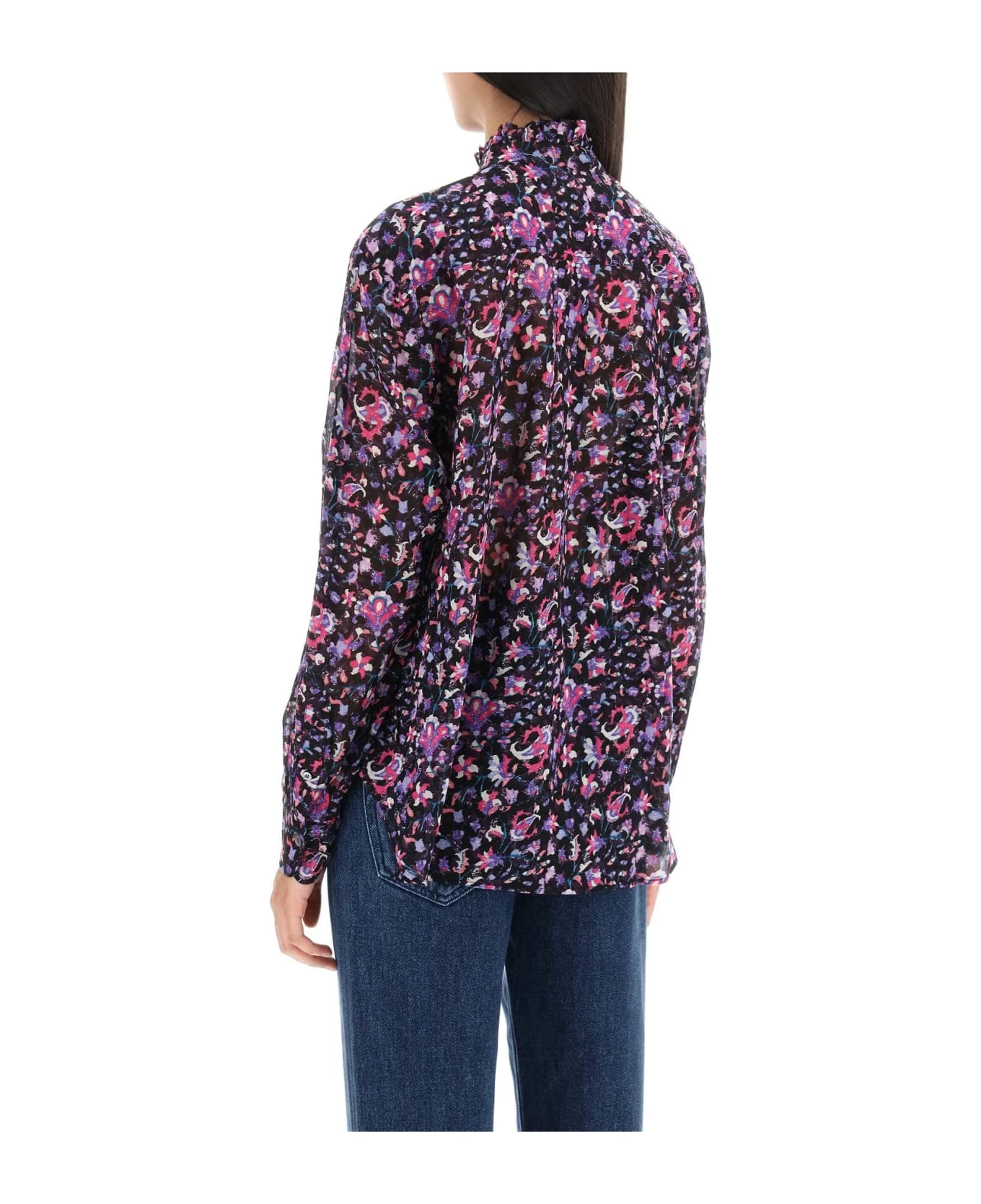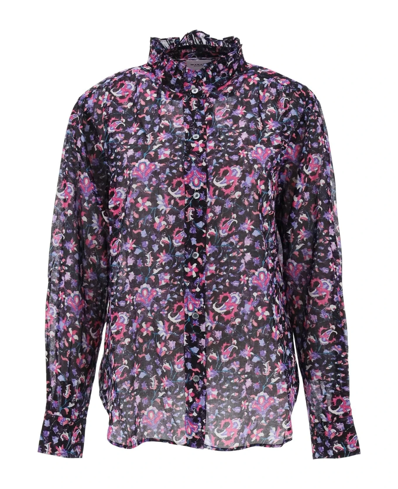 Marant Etoile button-up shirt made from printed organic cotton voile. Designed for a loose fit, it has a frilled banded collar, subtle gathered detailing at the shoulders, and a curved hemline. The model is 177 cm tall and wears a size FR 34.