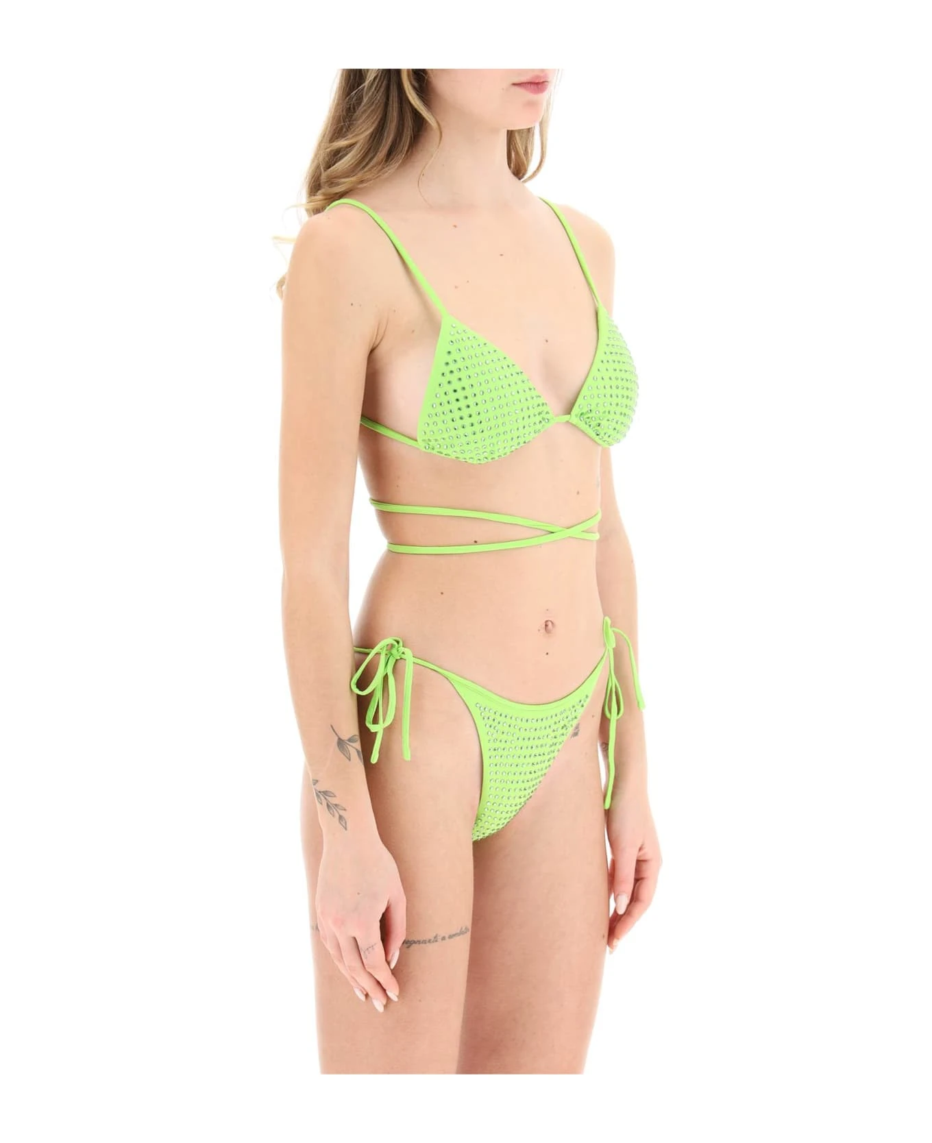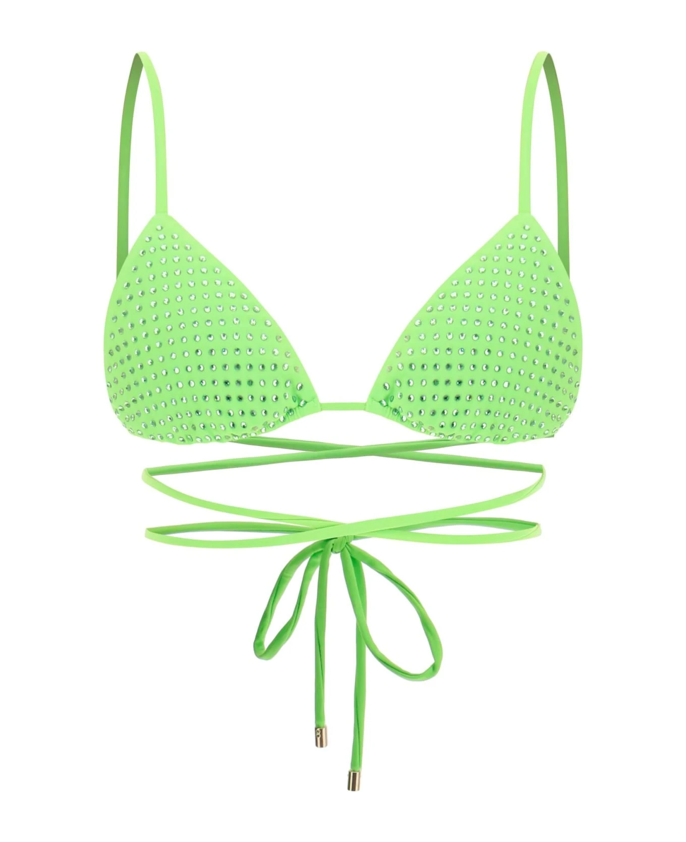 Triangle bikini top by Self Potrait in stretch technical fabric with applied crystals. Adjustable thin straps, tie-and-cross back closure, removable padding. The model is 177 cm tall and wears a size UK 6.