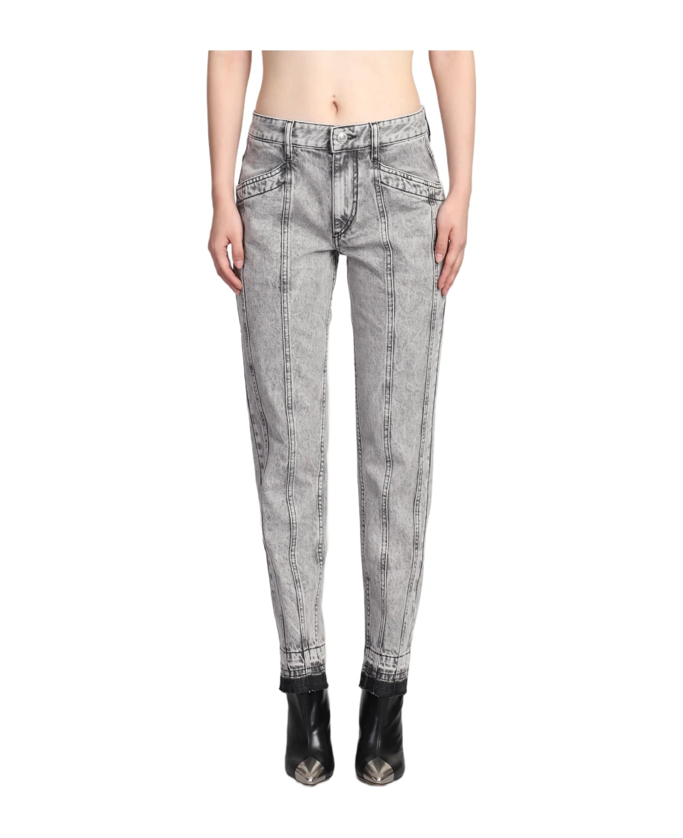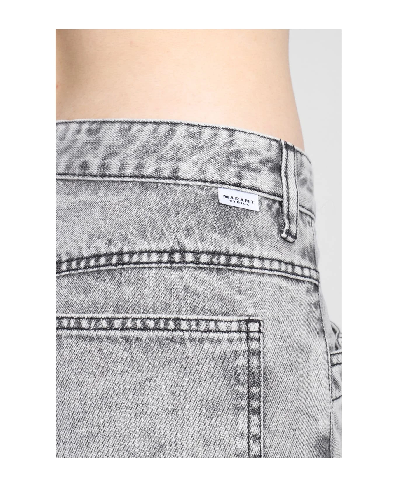 Sulanoa Jeans in grey cotton, button and zip closure, waist belt loops, pockets, stitching detail, 100% cotton, Made in Morocco, Model is 1. 77 cm and wear size 38