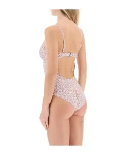 Tory Burch one-piece swimsuit made of Sensitive® stretch fabric with all-over floral pattern, featuring a sweetheart neckline with underwired cups and removable paddings, thin adjustable straps, hook back closure, and wide back opening. The model is 177 cm tall and wears a size S.