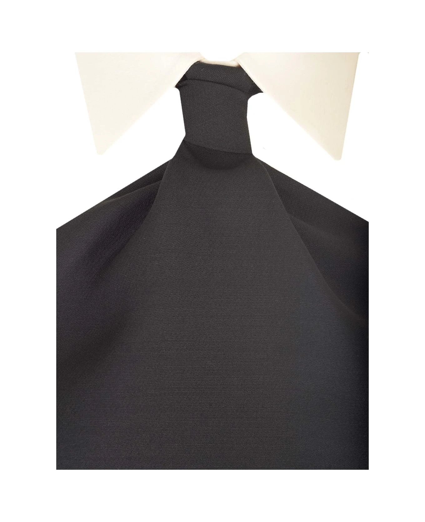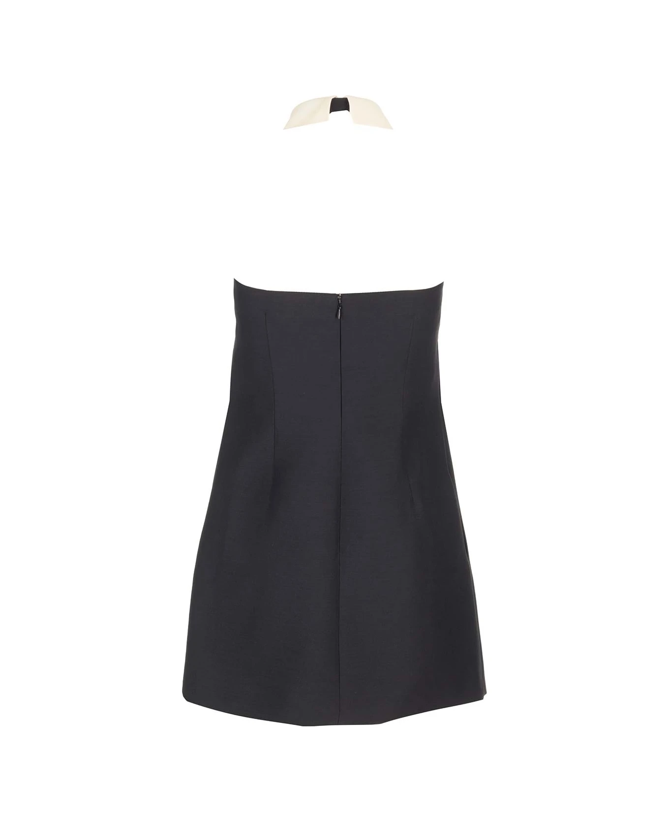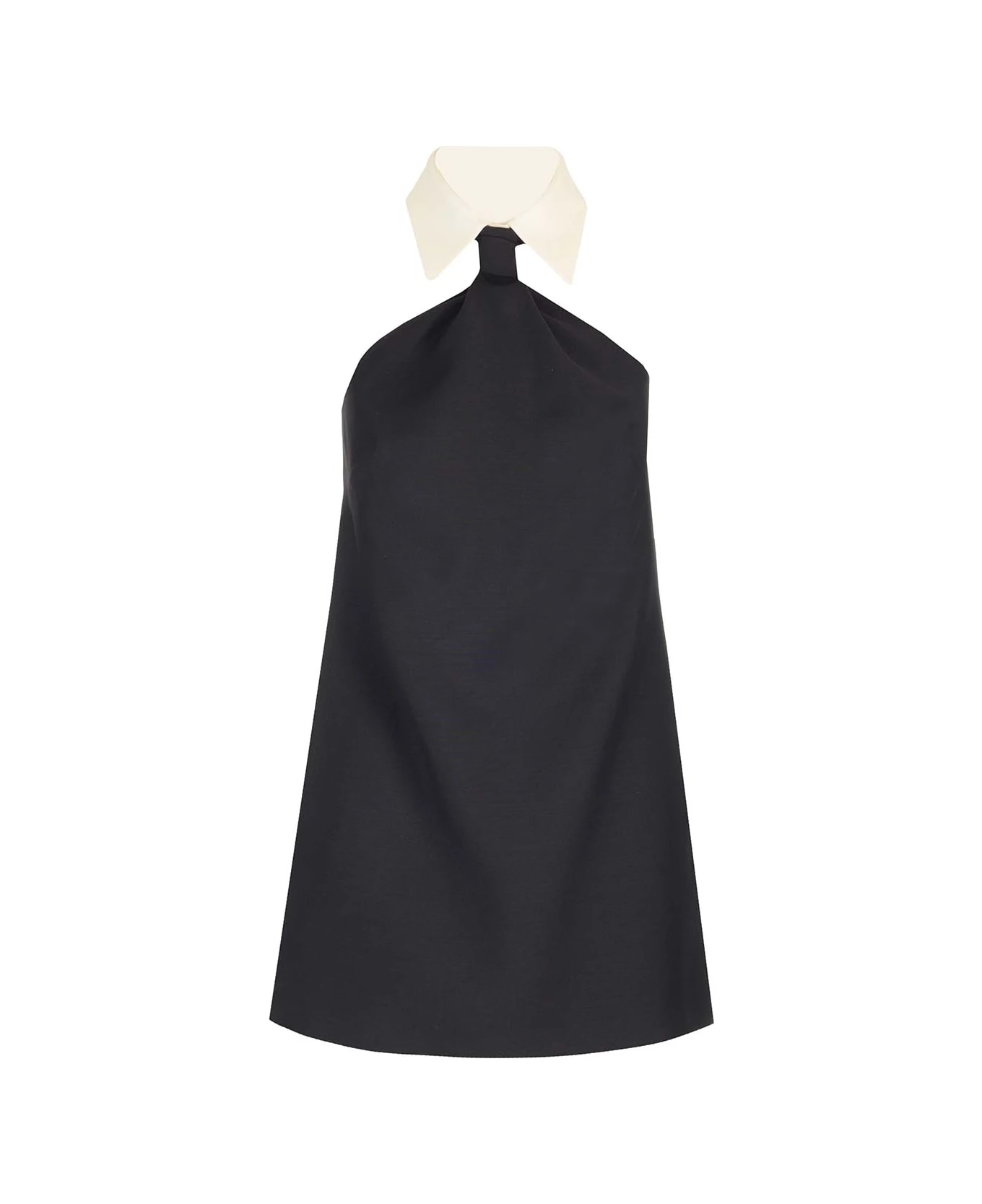 Black mini dress from Valentino Garavani in Crepe Couture, white poplin collar detail, back neckline, sleeveless.