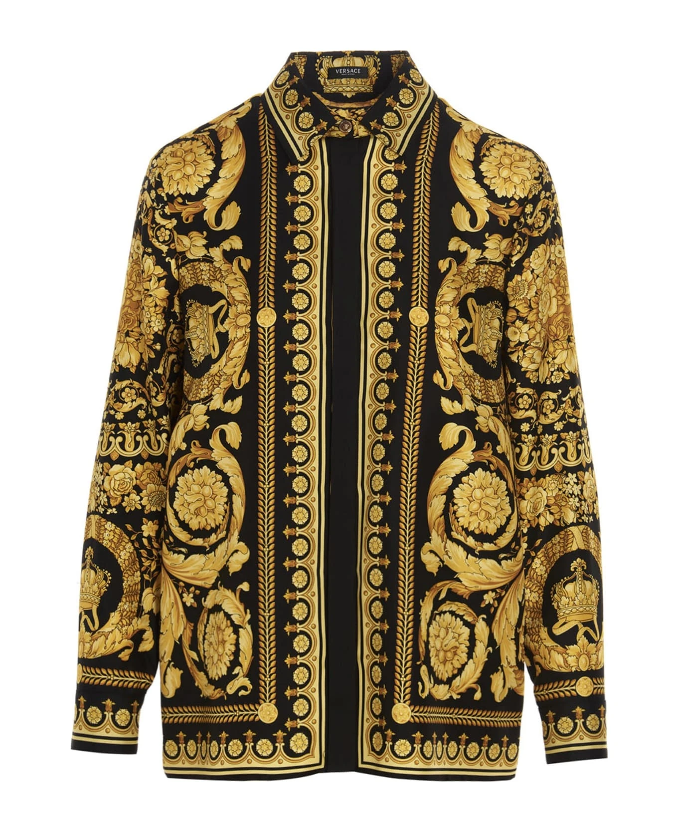 All over ‘Barocco Heritage’ silk shirt with button closure, long cuffed sleeves, and a Medusa button on the collar.
