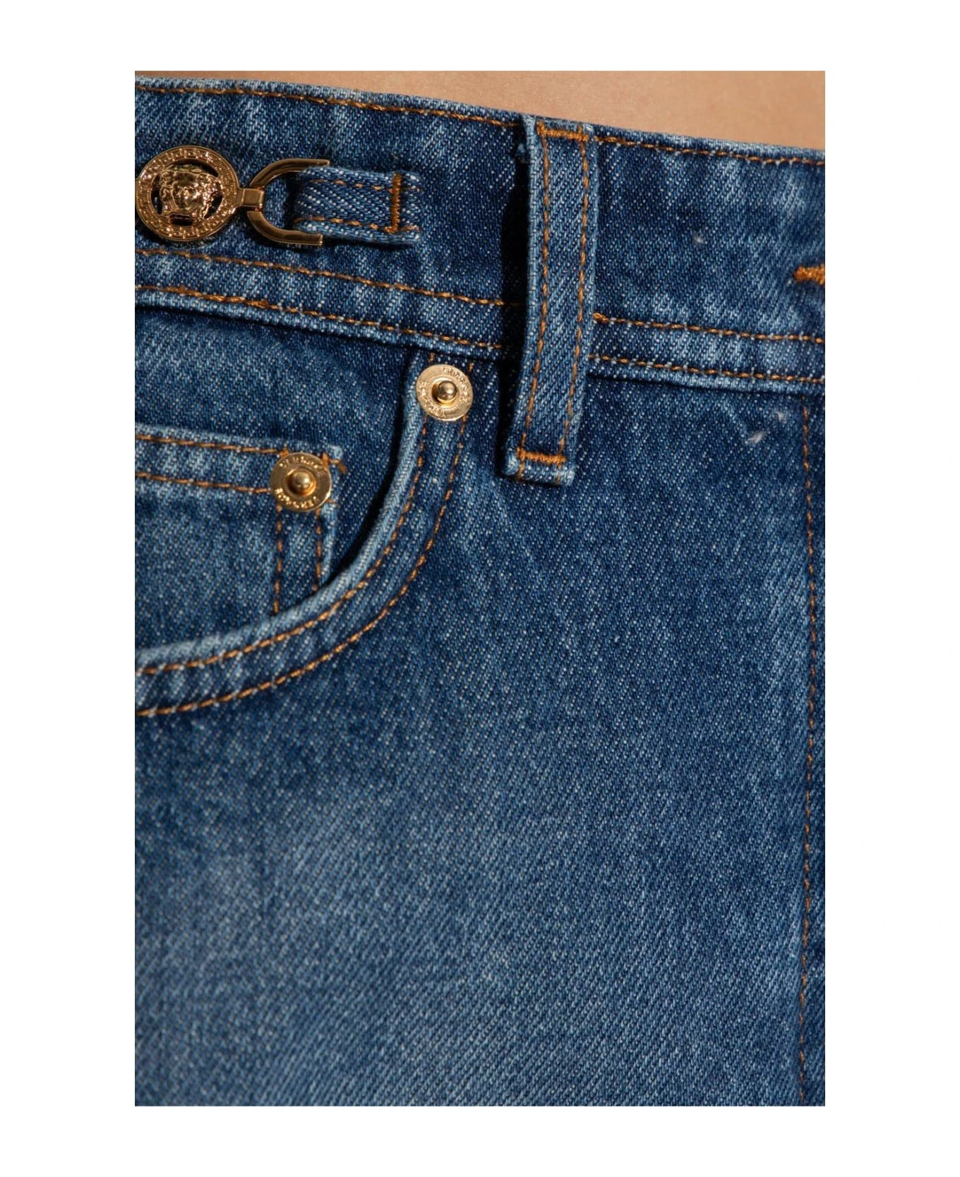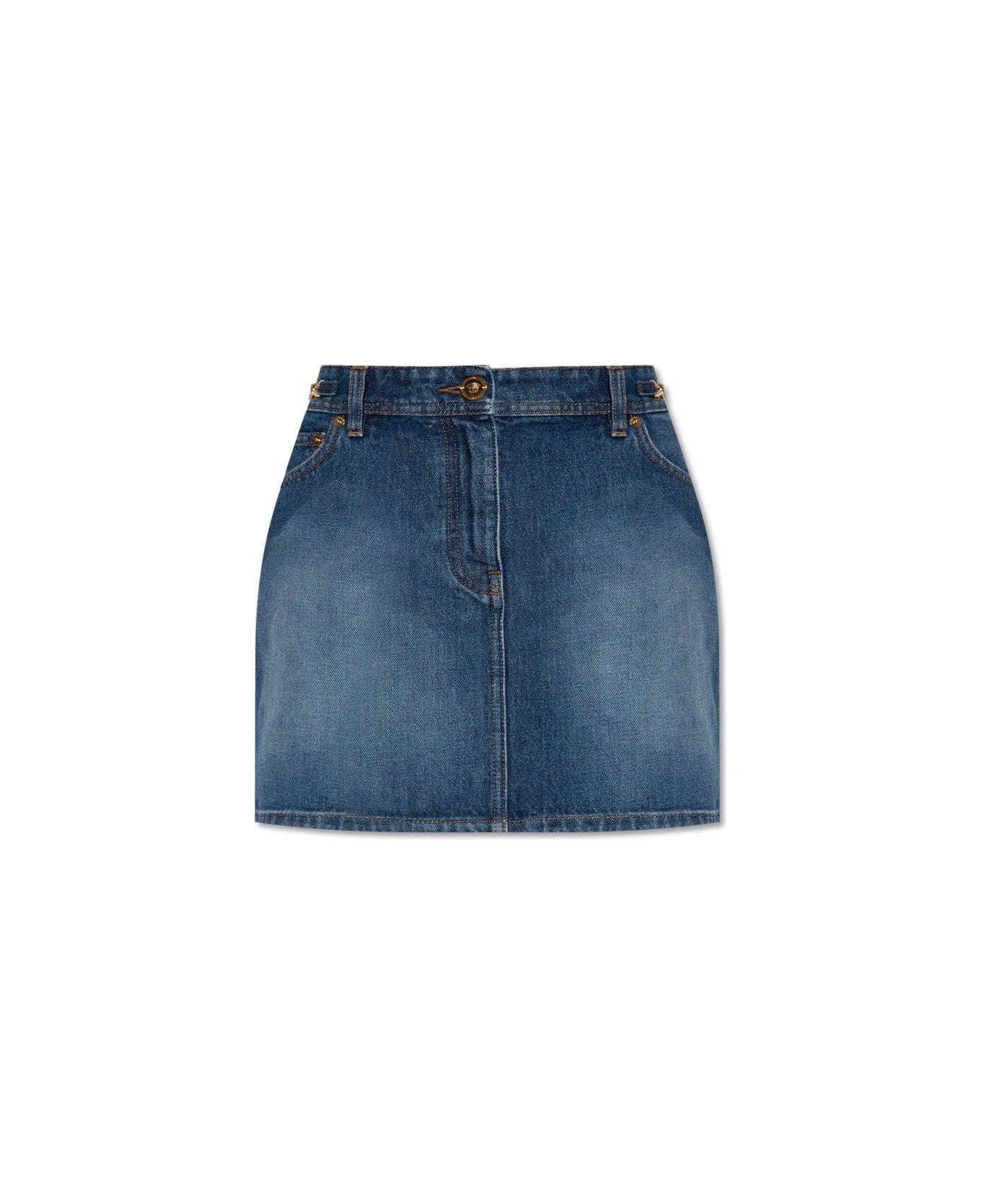 Versace Medusa Embellished Mini Denim Skirt