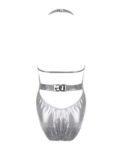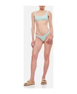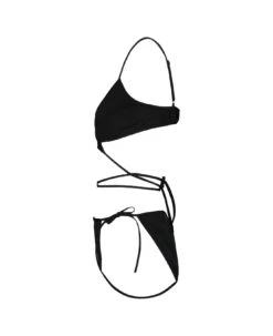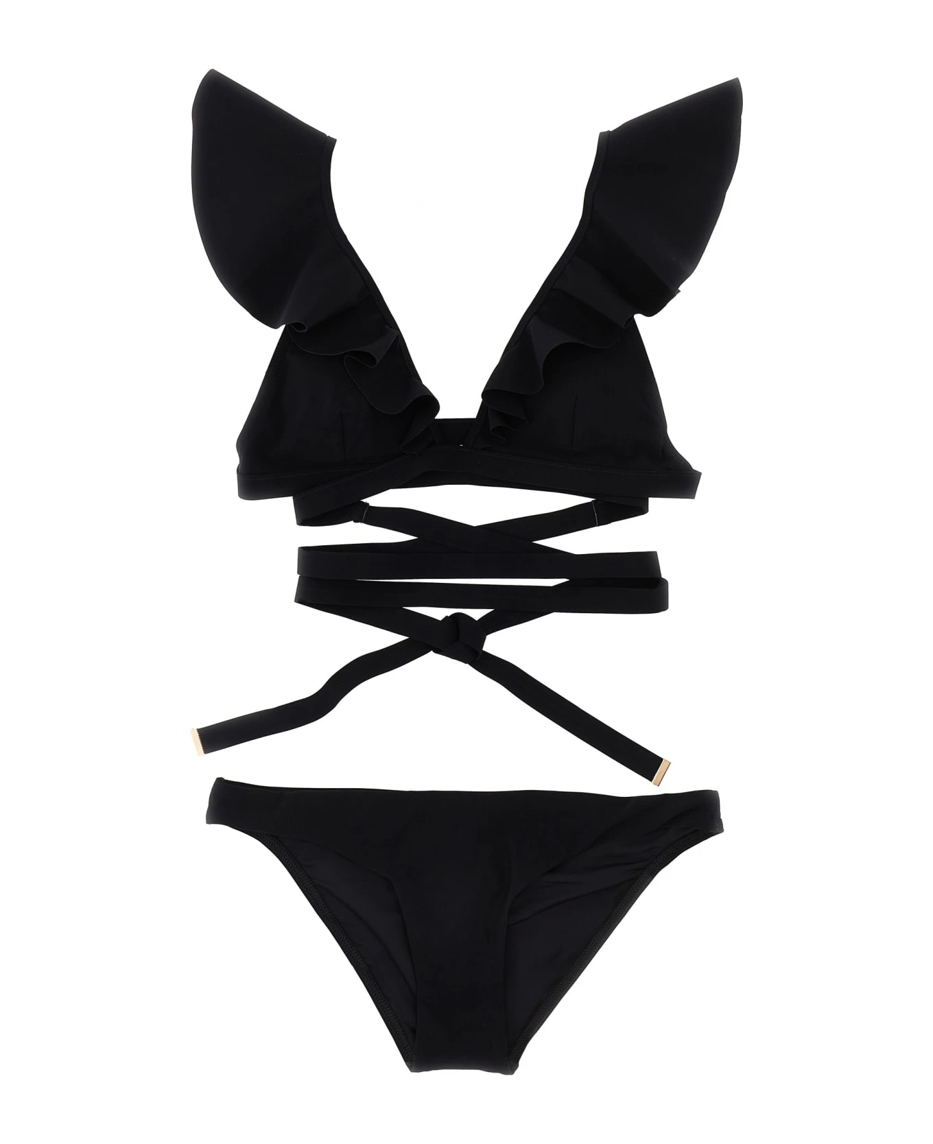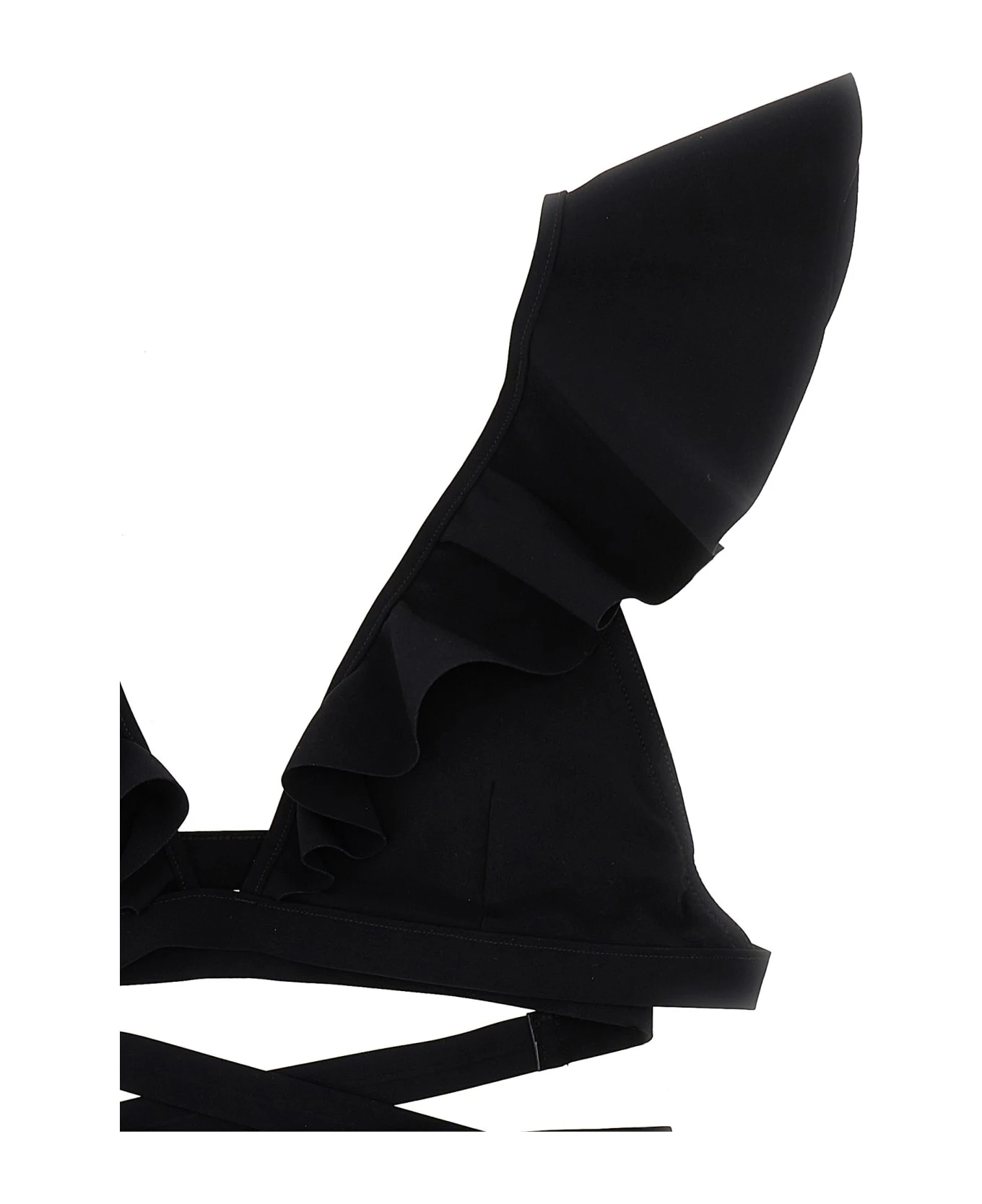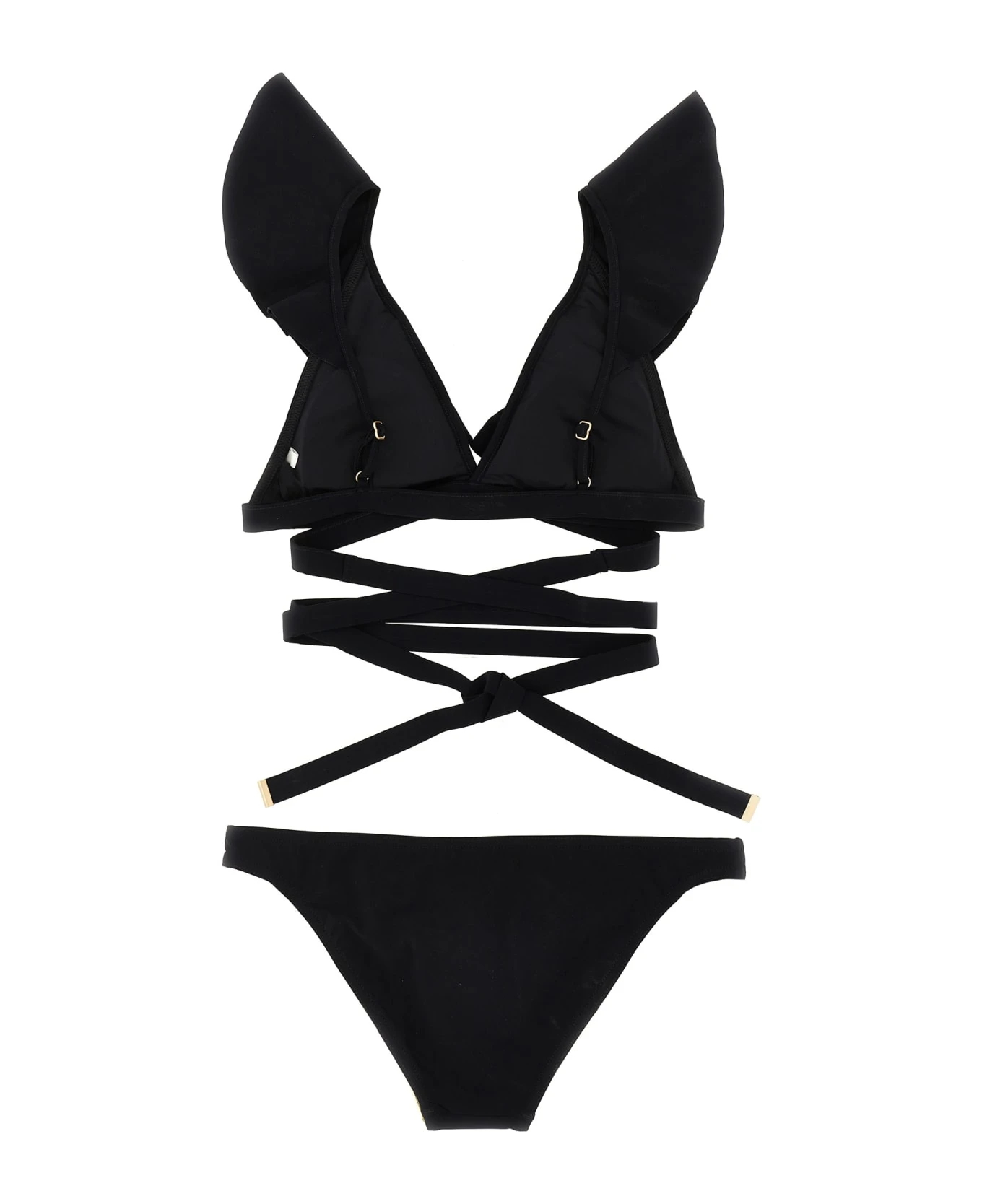 Halcyon bikini in stretch fabric with triangle top, ruffles, cups with removable padding, and basic bottoms.